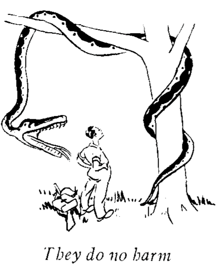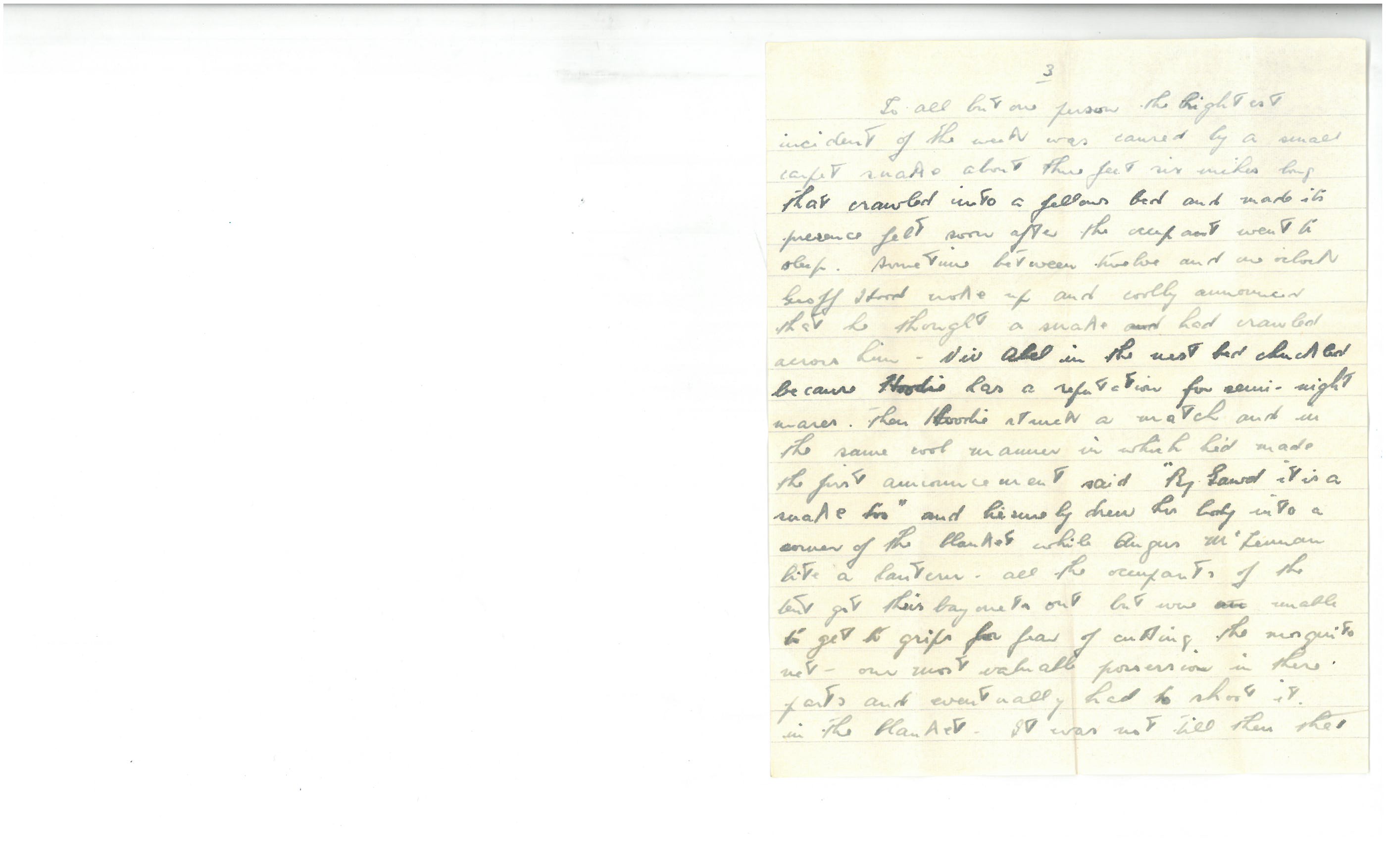To all but one person the brightest incident of the week was caused by a small carpet snake about three feet six inches long that crawled into a fellow’s bed and made its presence felt soon after the occupant went to sleep. Sometime between twelve and one o’clock Geoff Hood woke up and coolly announced that he thought a snake had crawled across him. Viv Abel in the next bed chuckled because Hoodie has a reputation for semi-nightmares. Then Hoodie struck a match and in the same cool manner in which he’d made the first announcement said ‘By Gawd it is a snake too” and leisurely drew his body into a corner of the blanket while Angus McLennan lit a lantern. All the occupants of the tent got their bayonets out but were unable to get to grips for fear of cutting the mosquito net – our most valuable possession in these parts – and eventually had to shoot it in the blanket. It was not till then that they found it was a carpet snake and to all intents and purposes harmless but for all that a most unwelcome bed mate. There are hundreds of snakes of various sorts come after the rats but the mob kill the snakes and of course the rats are able to multiply.