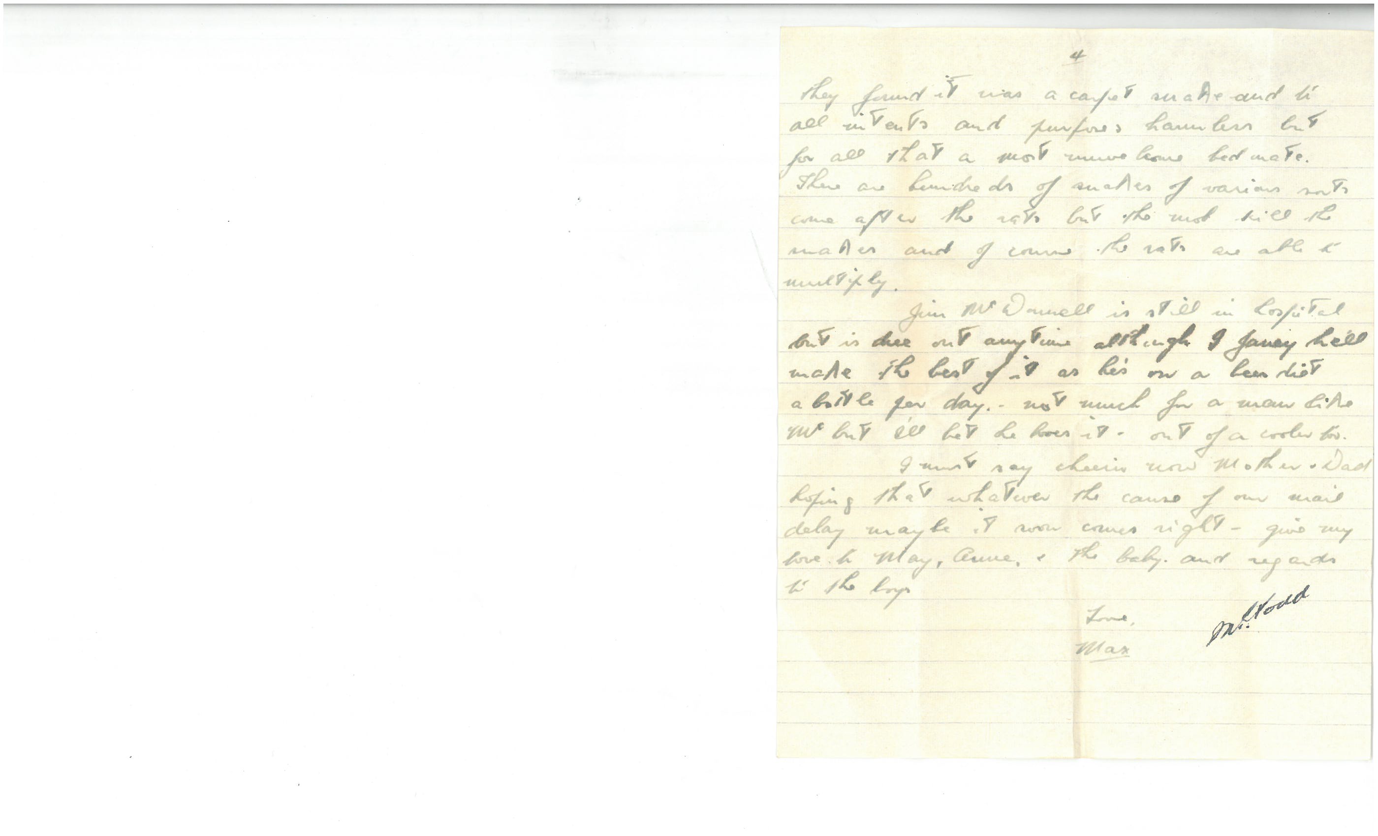 I must say cheerio now Mother & Dad. Hoping that whatever the cause of our mail delay may be it soon comes right. Give my love to May, Anne & the baby and regards to the boys.