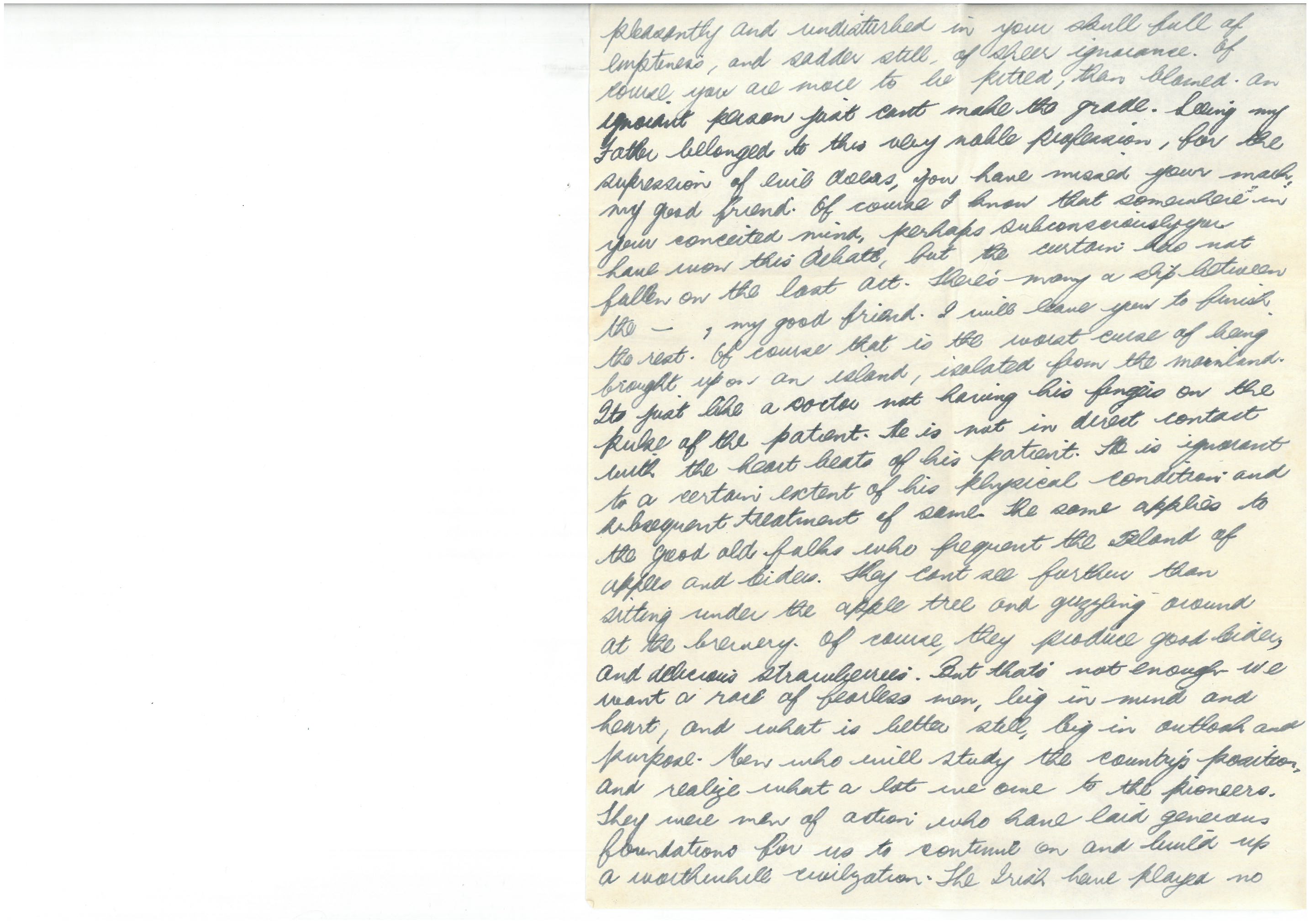 Now that’s no. 1 point. Now to proceed to No.2. The remark about hordes of ‘fat lazy policemen’ is just a lazy ignorant notion, floating around quite pleasantly and undisturbed in your skull full of emptiness, and sadder still, of sheer ignorance. Of course you are more to be pitied, than blamed. An ignorant person just can’t make the grade. Seeing my father belonged to this very noble profession, for the suppression of evil doers, you have missed your mark my good friend. Of course I know that somewhere in your conceited mind, perhaps subconsciously you have won this debate, but the curtain las not fallen on the last act. There’s many a slip between the —, my good friend. I will leave you to finish the rest. Of course that is the worst curse of being brought up on an island, isolated from the mainland. It’s just like a doctor not having his fingers on the pulse of the patient. He is not in direct contact with the heart beats of his patient. He is ignorant to a certain extent of his physical condition and subsequent treatment of same. The same applies to the good old folks who frequent to Island of apples and cider. They can’t see further than sitting under the apple tree and guzzling around at the brewery. Of course, they produce good cider and delicious strawberries. But that’s not enough – we want a race of fearless men, big in mind and heart, and what is better still, big in outlook and purpose. en who will study the country’s position and realise what a lot we owe to the pioneers. They were men of action who have laid generous foundations for us to continue on and build up a worthwhile civilization. The Irish have played no small part. Whatever our opinions are, we must be fair, and give credit, where credit is due. That’s the manly thing. Now my honourable friend I will leave you to chew and digest well before you take up your defences. I leave it to your own discretion how to proceed.
