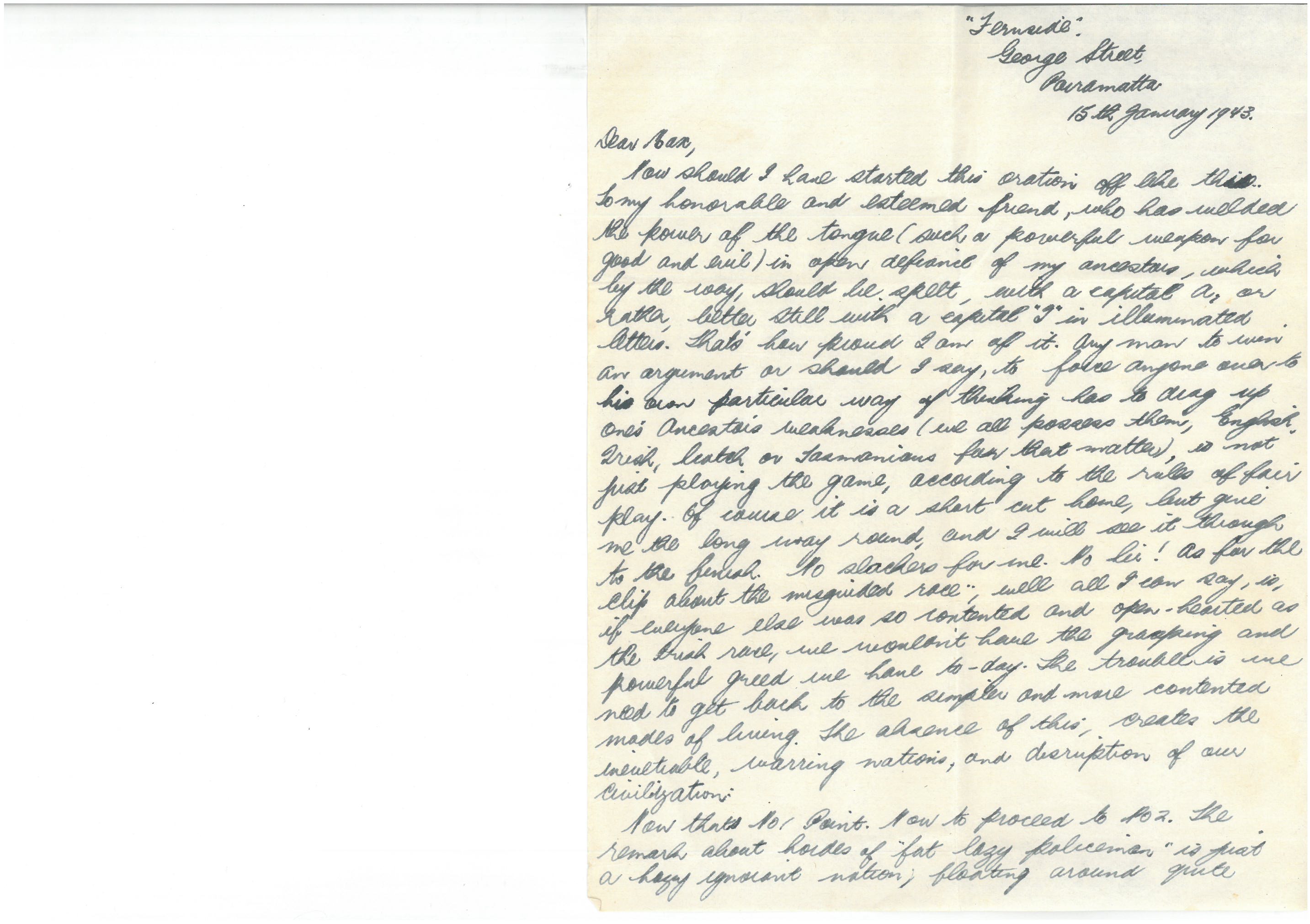 I believe that Kathleen who sent this letter is the Mrs Toomey to whom Dad often refers. She has nephews fighting in New Guinea, so is clearly of the ‘older generation’ rather than any sort of ‘girlfriend’. I don’t know what her connection with the family is, but it’s clear she was close to Ivy (‘Youngster’) and Bill, because she was apparently advised of the birth of their son on the same time day Dad was told via telegram. Although I don’t have the letter Dad sent to her, it’s clear they were ‘debating’ by mail.