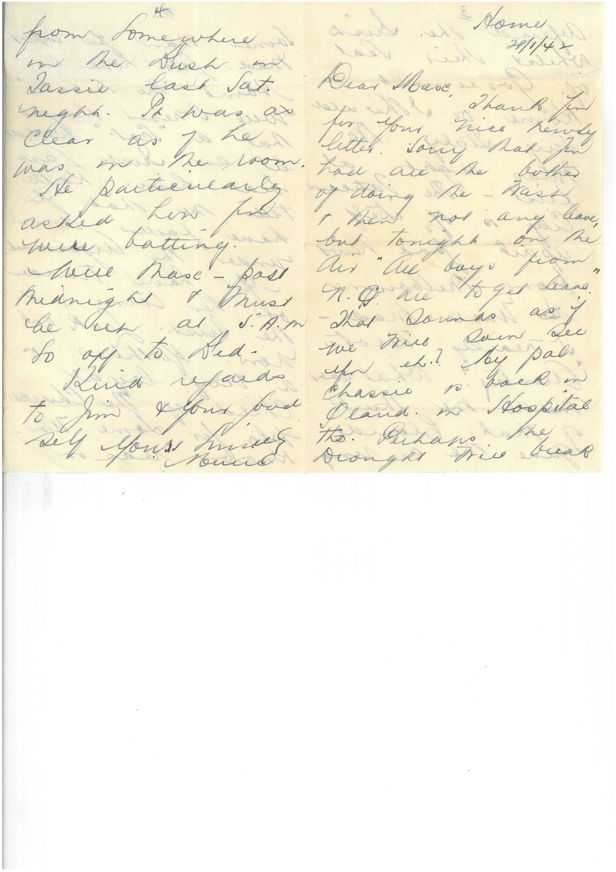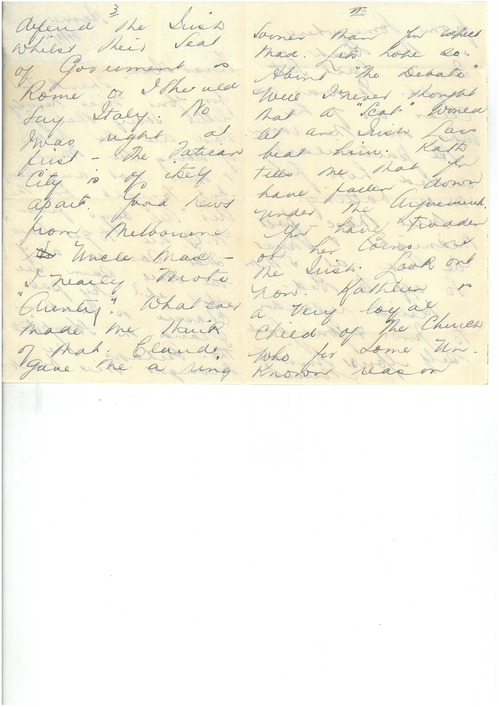 Thank you for your nice newsy letter. Sorry that you had all the bother of doing the trash & then not any leave, but tonight on the air “All boys from New Guinea to get leave”. That sounds as if we will soon see you eh? My pal Chassie is back in Qland, in hospital tho. Perhaps the drought will break sooner than you expect Max. Let’s hope so. About ‘the debate’ – well, I never thought that a ‘Scot’ would let an Irish lass beat him. Kath tells me that you have fallen down under the argument. You have trodden on her coins re the Irish. Look out now. Kathleen is a very loyal child of the Church who for some unknown reason defend the Irish whilst their seat of Government is Rome or I should say Italy. No I was right at first – the Vatican City is of itself apart. Good news from Melbourne Uncle Max. I nearly wrote “Aunty”. Whatever made me think of that. Claude gave me a ring from somewhere in the bush in Tassie last Sat night. It was as clear as if he was in the room. He particularly asked how you were batting.