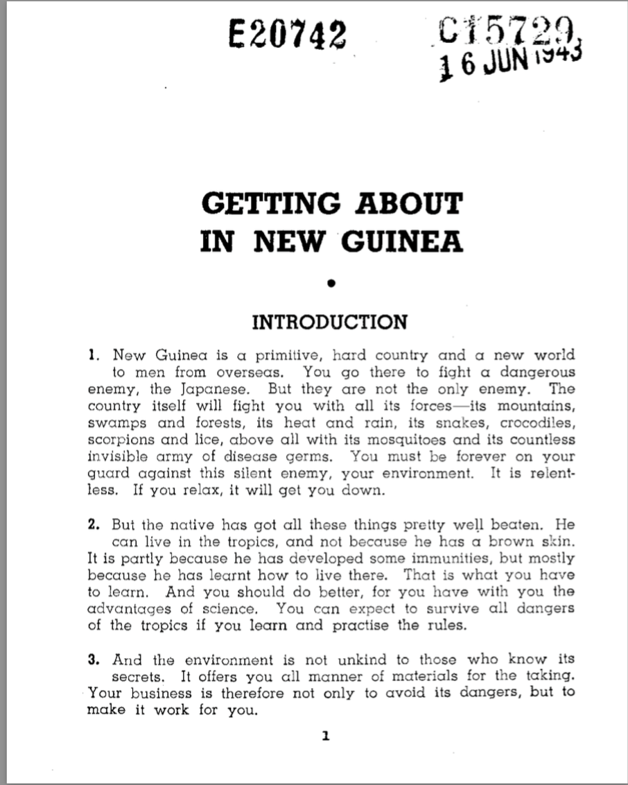 This booklet for troops was published in April 1943. It reads more like a guide book for boy scouts about to embark on an ‘outward bound’ course rather than a serious and useful handbook for front line troops.