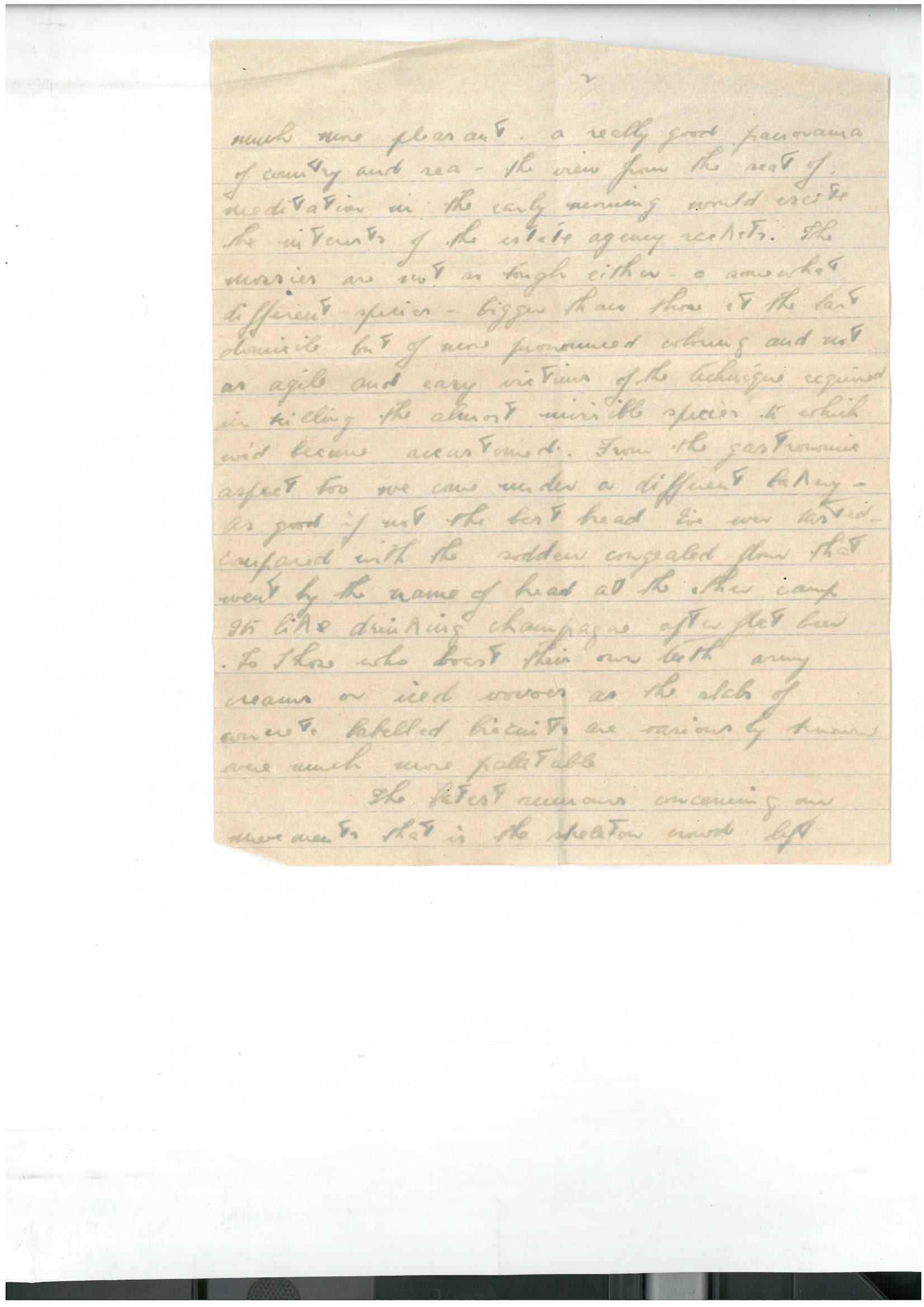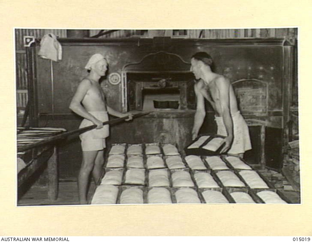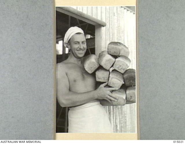 The powers that be staged a show for us recently involving a change of scenery but nothing more. With dramatic suddenness we got word to move one night at two o’clock and by three o’clock were in transit. As a test of efficiency it was good although we had to dice (ditch?) a lot of stuff that though not necessary to the war effort afforded us a measure of personal comfort. However the change has its compensations – the outlook is much more pleasant – a really good panorama of country and sea. The view from the seat of meditation in the early morning would excite the interests of the estate agency rackets. The mozzies are not so tough either – a somewhat different species – bigger than those at the last domicile but of more pronounced colouring and not as agile and easy victims of the technique required in killing the almost invisible species to which we’d become accustomed. From the gastronomic aspect too we come under a different bakery – as good if not the best I’ve ever tasted compared with the sodden congealed flour that went by the name of bread at the other camp. It’s like drinking champagne after flat beer. To those who boast their own teeth army creams or iced vovos as the slabs of concrete labelled biscuits are variously known were much more palatable.