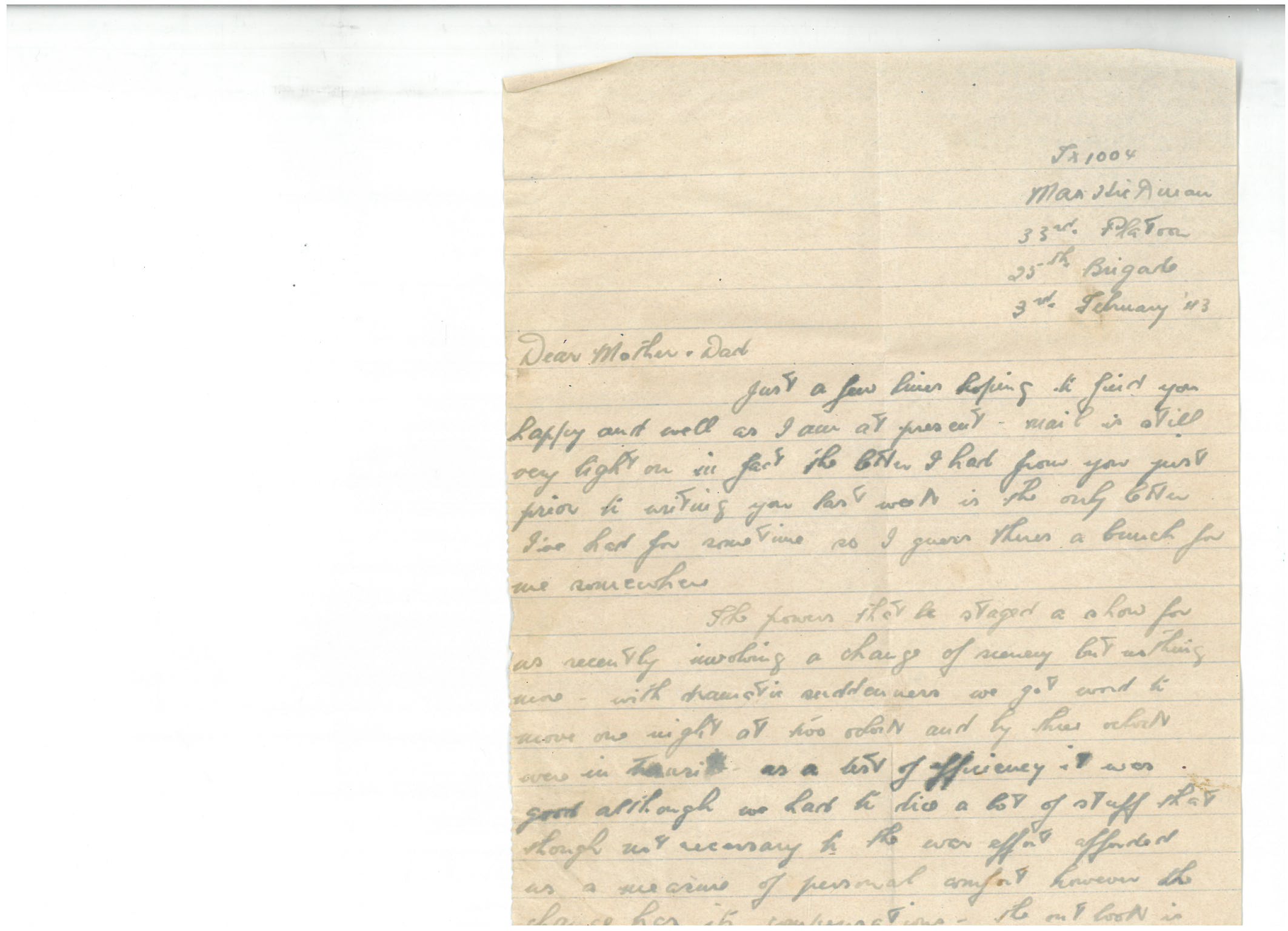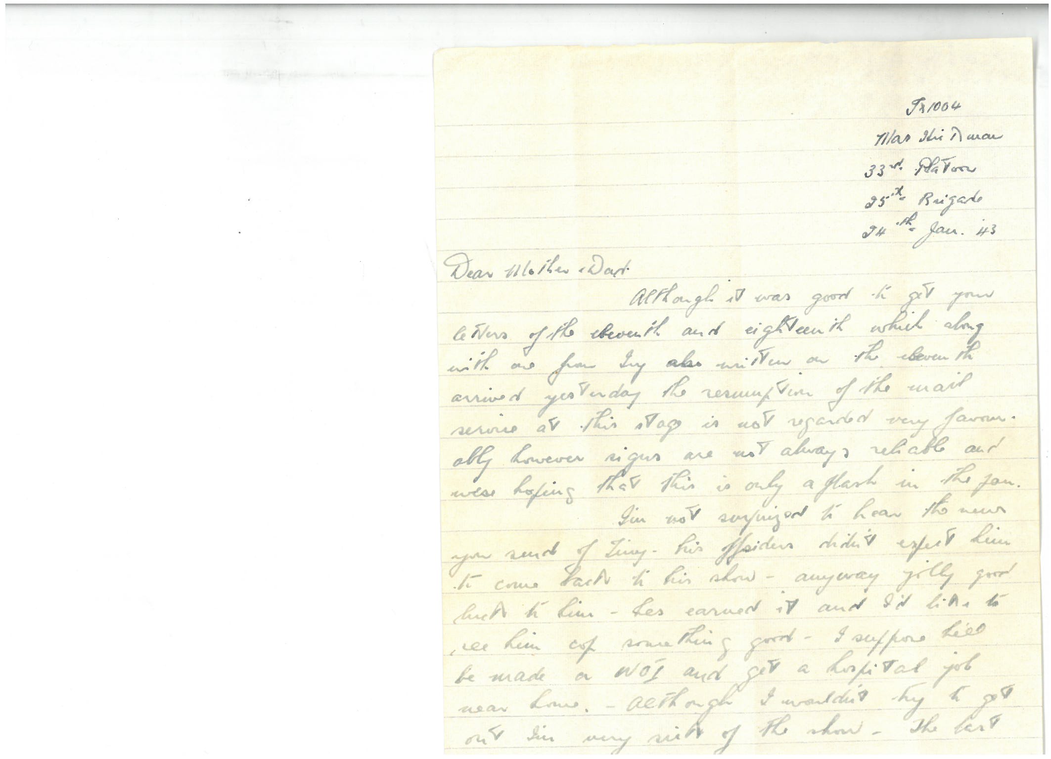 Although it was good to get your letters of the eleventh and eighteenth which along with one from Ivy written on the eleventh arrived yesterday, the resumption of the mail service at this stage is not regarded very favourably. However signs are not always reliable and we’re hoping that this is only a flash in the pan.