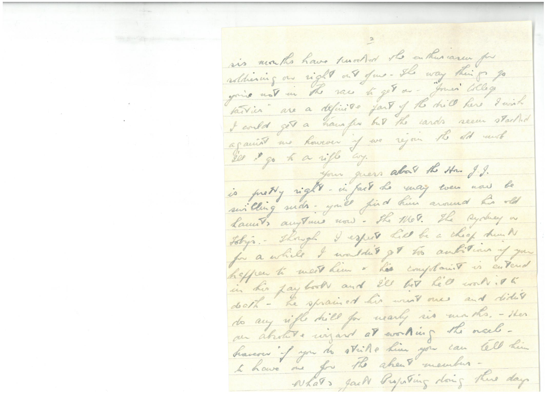 Your guess about the Hon J J is pretty right. In fact he may even now be swilling suds – you’ll find him around his old haunts anytime now – the Met, the Sydney or Toby’s. Though I expect he’ll be a cheap drunk for a while I wouldn’t get too ambitious if you happen to meet him – his complaint is entered in his paybook and I’ll bet he’ll work it to death. He sprained his wrist once and didn’t do any rifle drill for nearly six months. He’s an absolute wizard at working the oracle. However if you do strike him you can tell him to have one for the absent members.