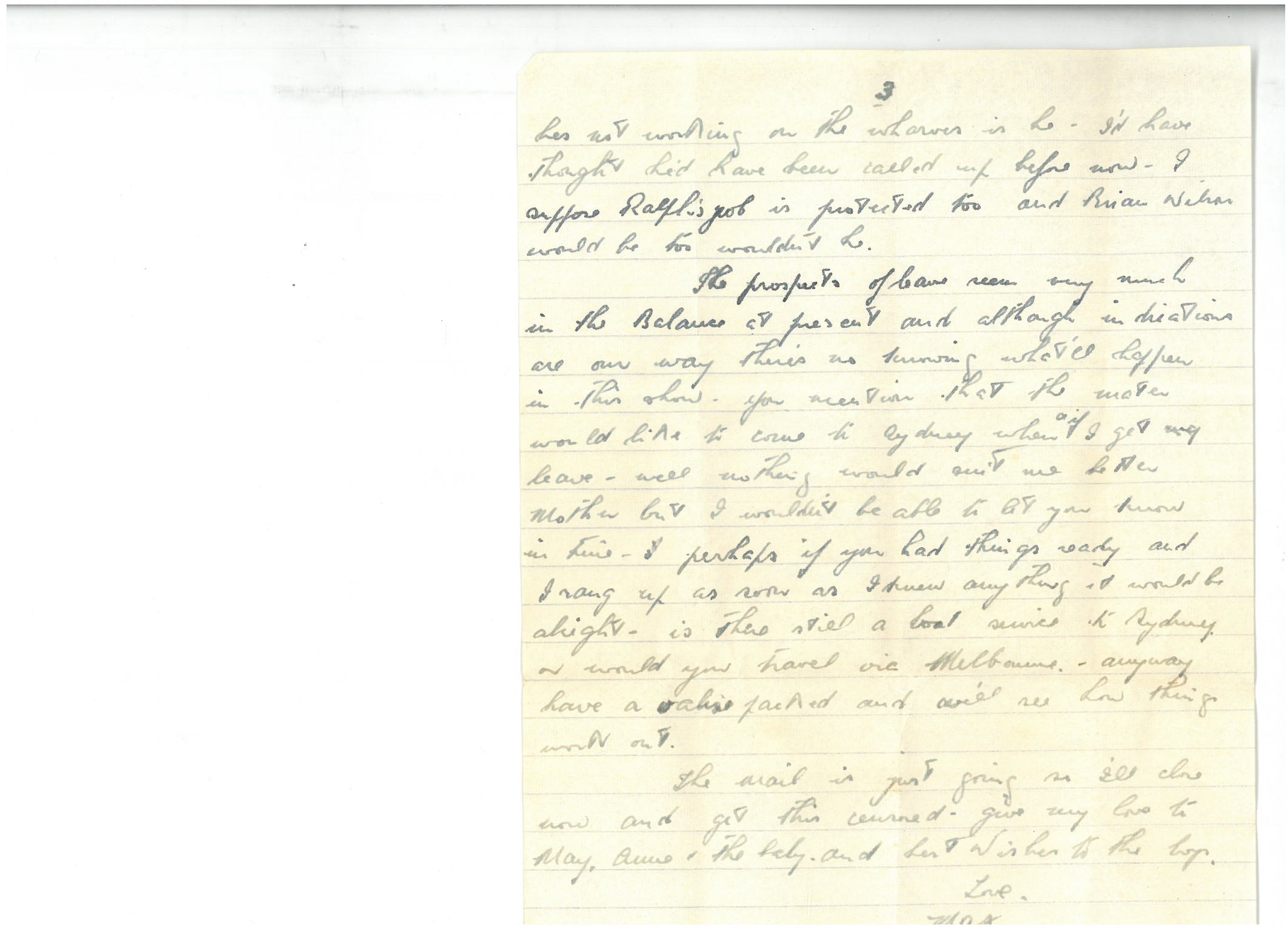 The prospects of leave seem very much in the balance at present and although indications are our way there’s no knowing what’ll happen in this show. You mention that the mater would like to some to Sydney when & if I get my leave – well nothing would suit me better Mother but I wouldn’t be able to let you know in time. Perhaps if you had things ready and I rang up as soon as I knew anything it would be alright. Is there still a boat service to Sydney or would you travel via Melbourne? Anyway, have a valise packed and we’ll see how things work out.