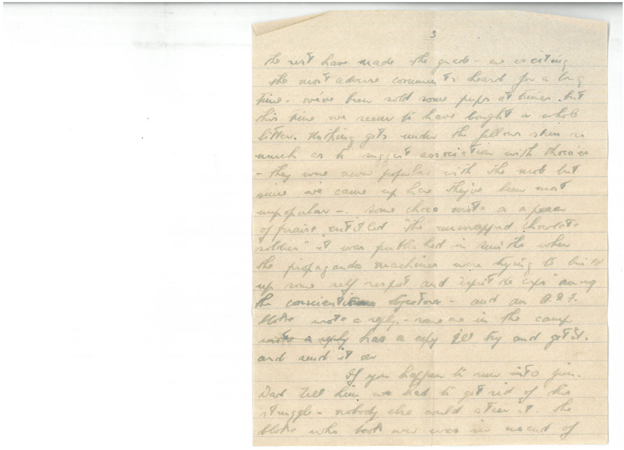 The latest rumours concerning our movements – that is the skeleton crowd left : the rest have made the grade – are exciting the most adverse comments heard for a long time. We’ve been sold some pups at times, but this time we seem to have bought a whole litter. Nothing gets under the fellows skin as much as to suggest association with choco’s – they were never popular with the mob but since we came up here they’ve been most unpopular. Some choco wrote a paean of praise entitled ‘the unwrapped chocolate soldier’. It was published in Smith’s when the propaganda machine were trying to build up some self respect and esprit de corps among the conscientious objectors – and an AIF bloke wrote a reply. Someone in the camp has a copy – I’ll try and get it and send it on.