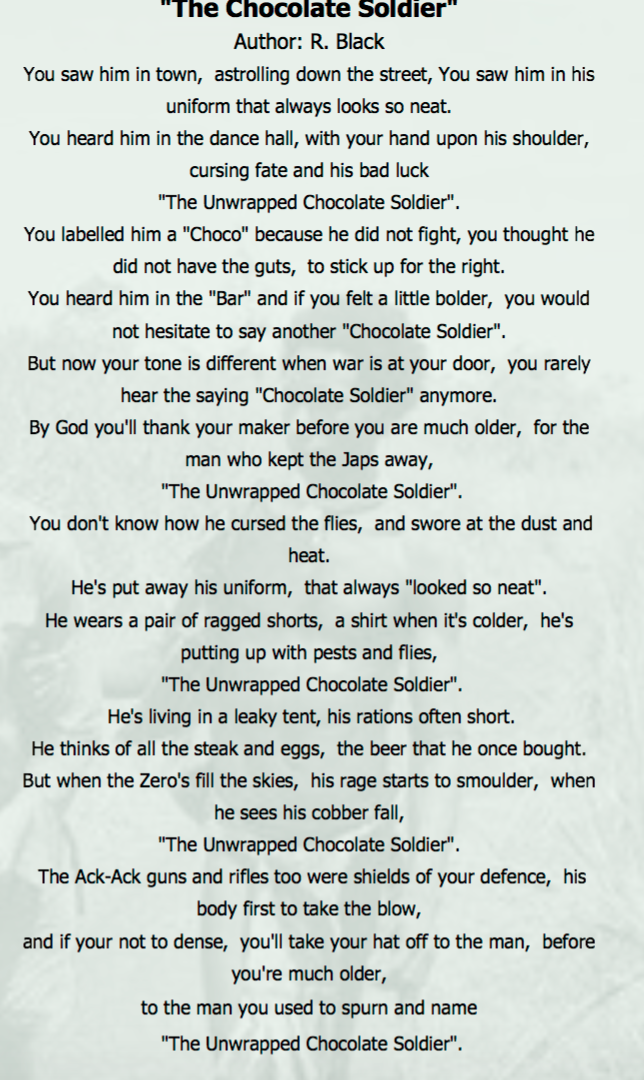 I’m surprised Dad is still expressing such a negative attitude toward the Militia (choco’s) : he appears to have them all labelled conscientious objectors. I don’t have a copy of the response from the ‘AIF bloke’ but the verse published in Smiths Weekly is reproduced here: