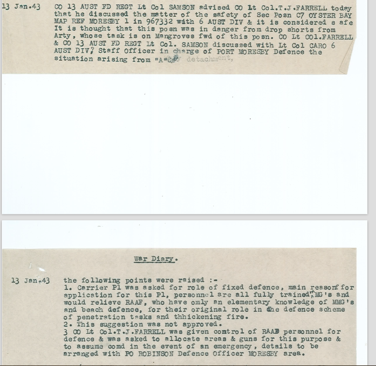 It’s clear from the war diary of the 7 Machine Gun Bn that they were keen to have the Carriers attached to their unit, given the expertise in MMG’s of the experienced men of Dad’s platoon – e.g. this extract from January 13. (AWM52 8/5/7)