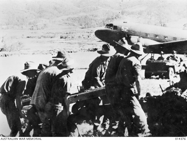 25 pounders are unloaded at Wau aerodrome. At this stage the Japanese were only a short distance from he aerodrome. These guns were assembled and went straight into action.