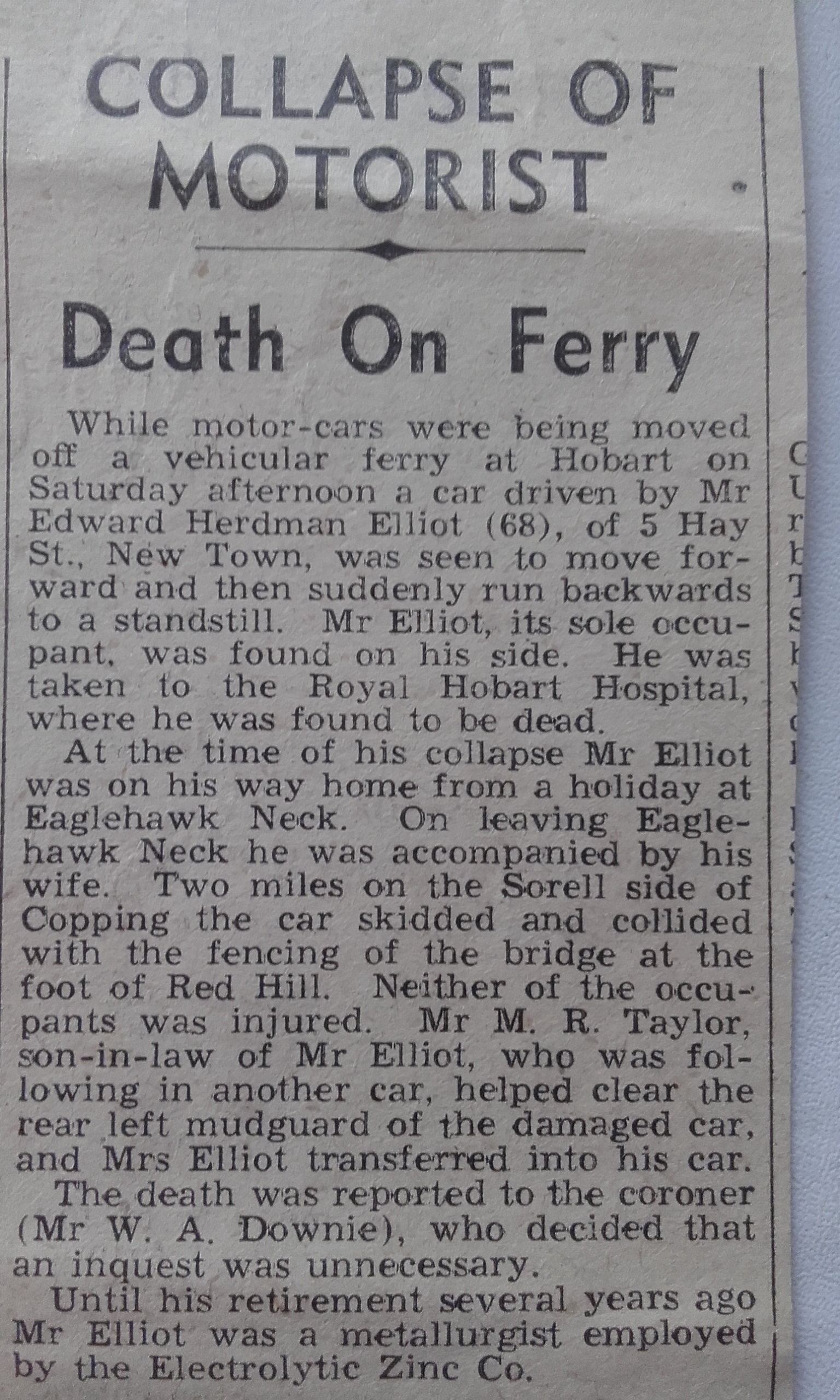 Article from the Hobart Mercury. Letters received from both Ivy and their father refer to Ted Elliott’s death in early February (cremation notice was dated February 9). The article which appeared in The Mercury regarding his death describes the circumstances of the event. It seems likely that the unusual nature of his passing, rather his standing in the Hobart community, might have been the reason it was noted in the New Guinea news sheet.