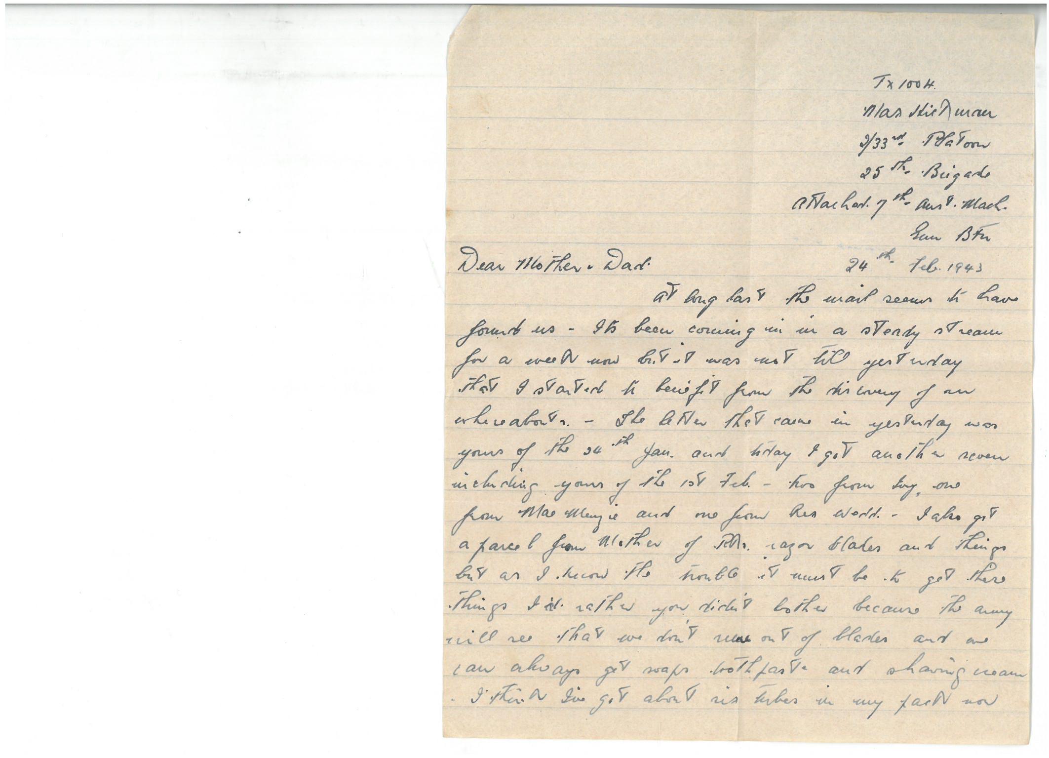 At long last the mail seems to have found us. It’s been coming in in a steady stream for a week now but it was not till yesterday that I started to benefit from the discovery of our whereabouts. The letter that came in yesterday was yours of the 24th Jan and today I got another seven including yours of the 1st Feb, two from Ivy, one from Mae Menzie and one from Rex Wedd. I also got a parcel from Mother of PK’s, razor blades and things but as I know the trouble it must be to get these things I’d rather you didn’t bother because the army will see that we don’t run out of blades and one can always get soaps, toothpaste and shaving cream- I think I’ve got about six tubes in my pack now – besides which not many parcels make the grade these days unless you keep the postal authorities informed of changes of address the parcels are sent to the hospitals and in our case especially being seconded from the unit and with a change of address every few days even the income tax collectors would be hard put to it to keep track of us let alone postal authorities.