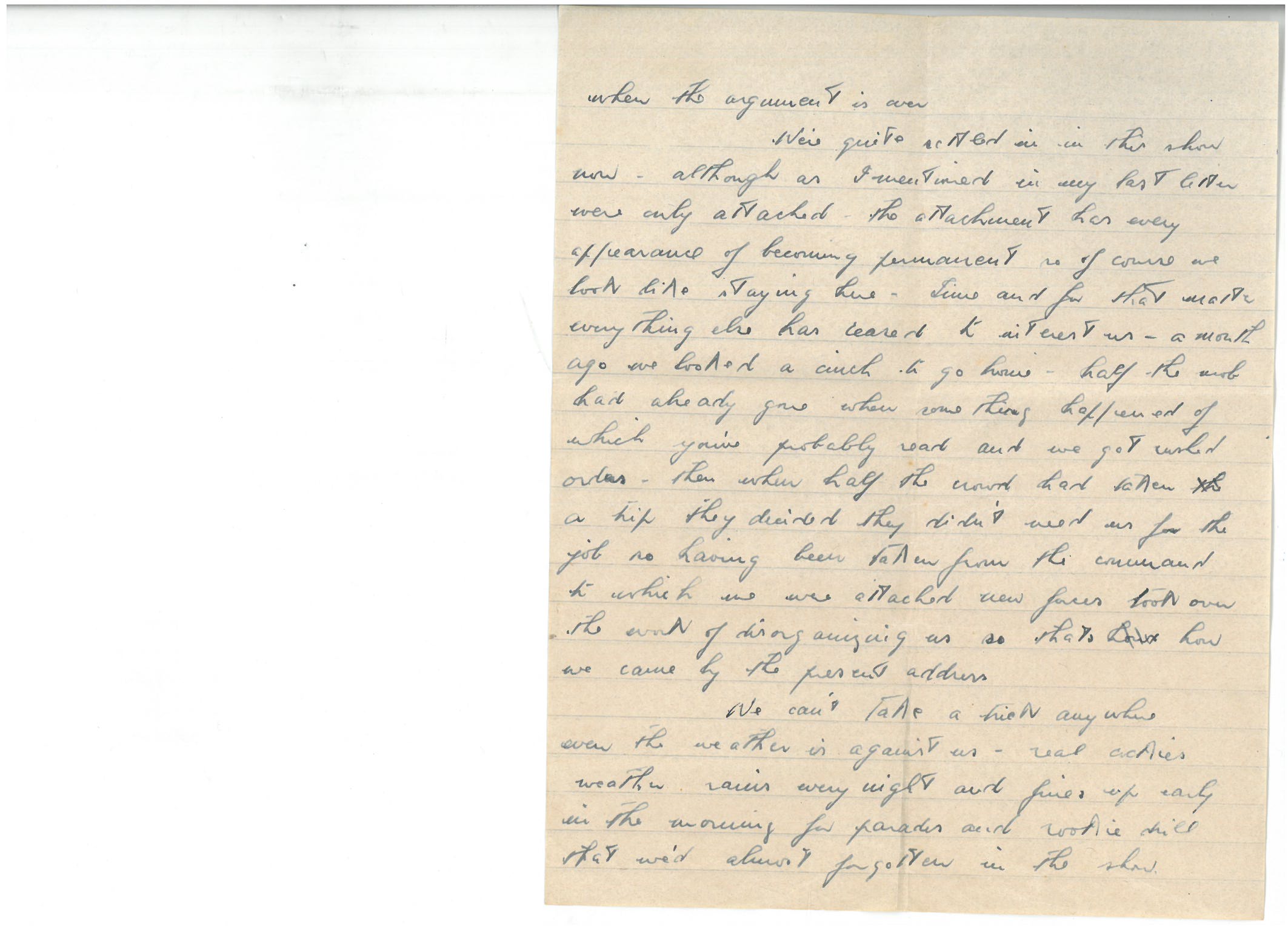 We’re quite settled in in this show now – although as I mentioned in my last letter we’re only attached, the attachment has every appearance of becoming permanent so of course we look like staying here. Time and for that matter everything else has ceased to interest us – a month ago we looked a cinch to go home, half the mob had already gone when something happened of which you’ve probably read and we got rushed orders. Then when half the crowd had taken a trip they decided they didn’t need us for the job so having been taken from the command to which we were attached, new forces took over the work of disorganising us so that’s now we came by the present address.