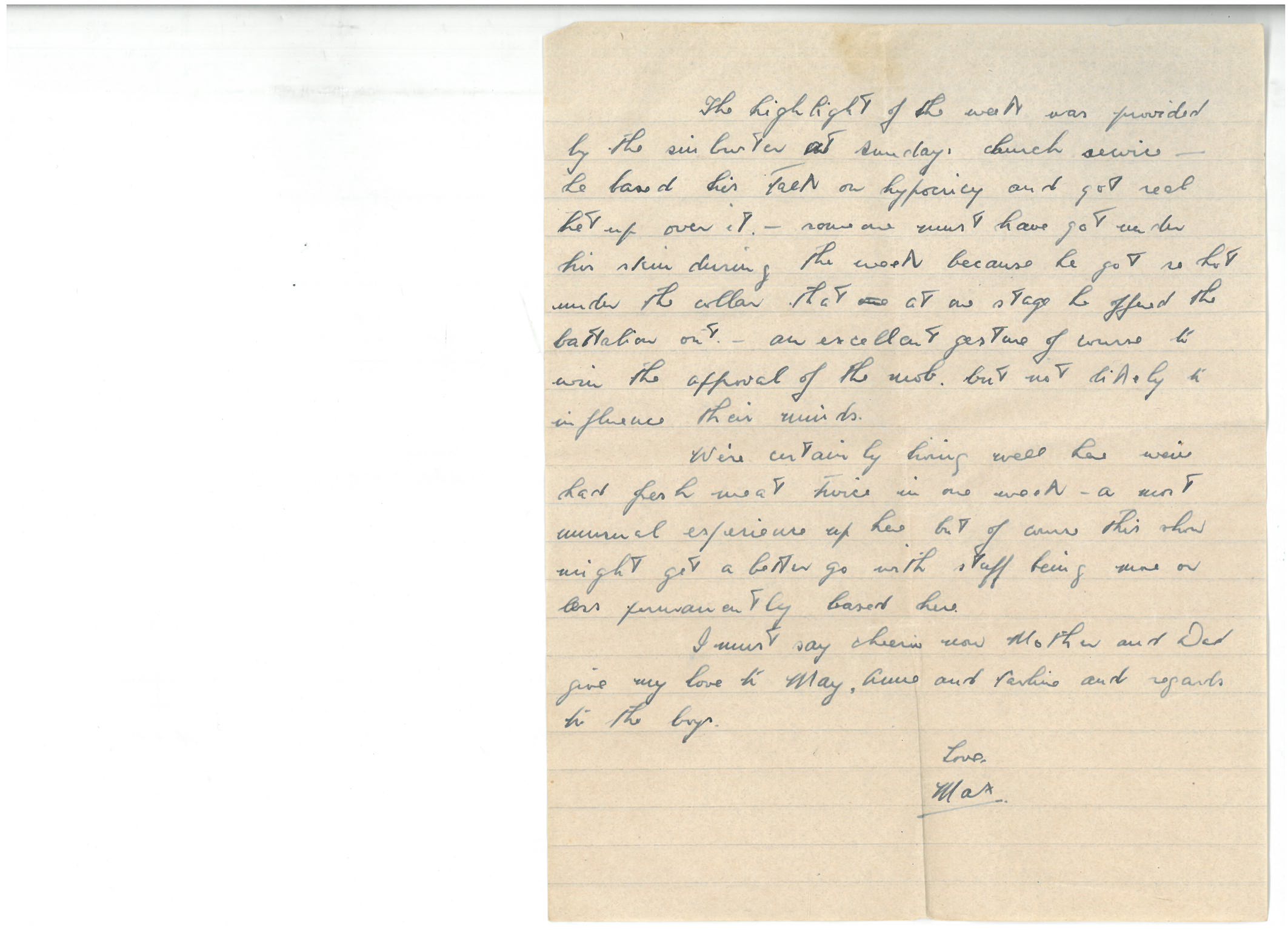 The highlight of the week was provided by the sinbuster at Sunday’s church service – he based his talk on hypocrisy and got real het up over it. Someone must have got under his skin during the week because he got so hot under the collar that at one stage he offered the battalion out – an excellent gesture of course to win the approval of the mob, but not likely to influence their minds.