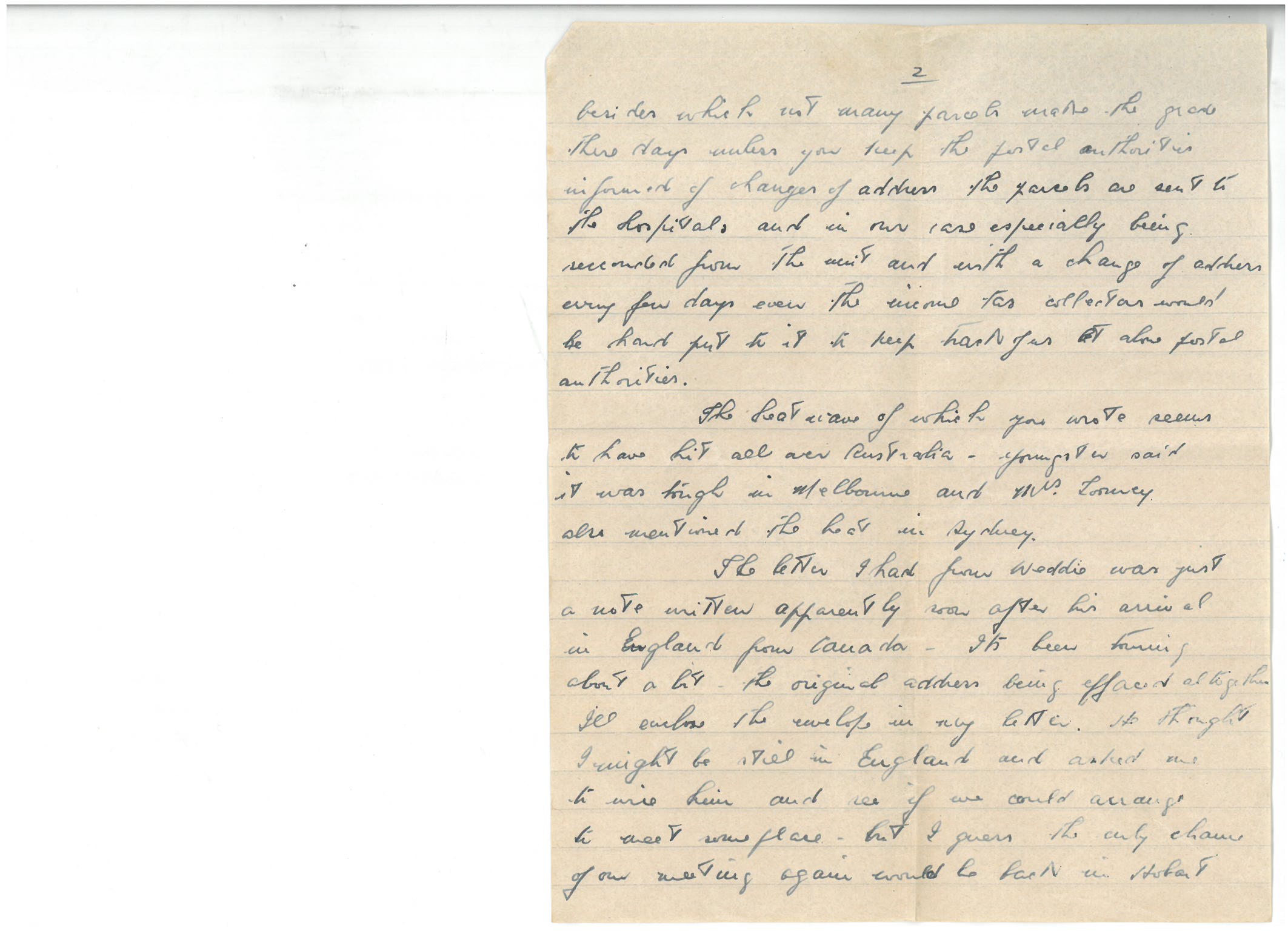 The letter I had from Weddie was just a note written apparently soon after his arrival in England from Canada. It’s been touring about a bit – the original address being defaced altogether. I’ll enclose the envelope in my letter. He thought I might be still in England and asked me to wire him and see if we could arrange to meet someplace, but I guess the only chance of our meeting again would be back in Hobart when the argument is over.