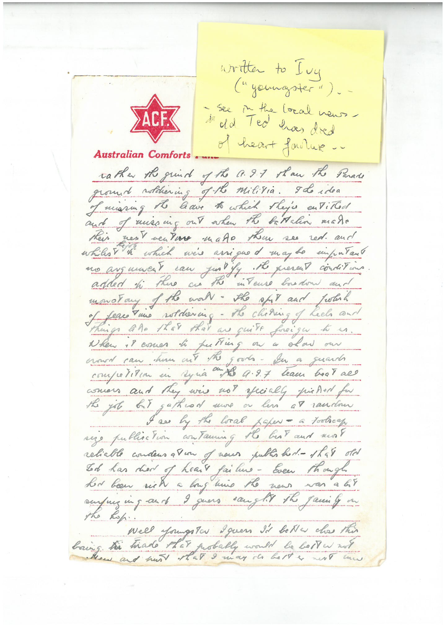 I see by the local paper – a foolscap size publication containing the best and most reliable condensation of news published – that old Ted has died of heart failure. Even though he’d been sick a long time the news was a bit surprising and I guess caught the family on the hop.