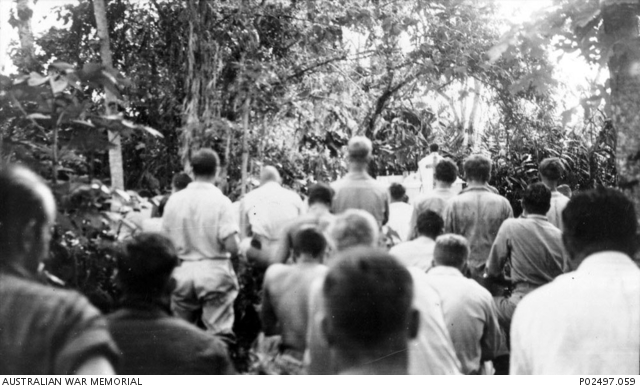 AWM P02497.059 Probably Port Moresby, New Guinea. c. 1942. Men of the 32nd Australian Heavy Anti-Aircraft Battery at a church parade.