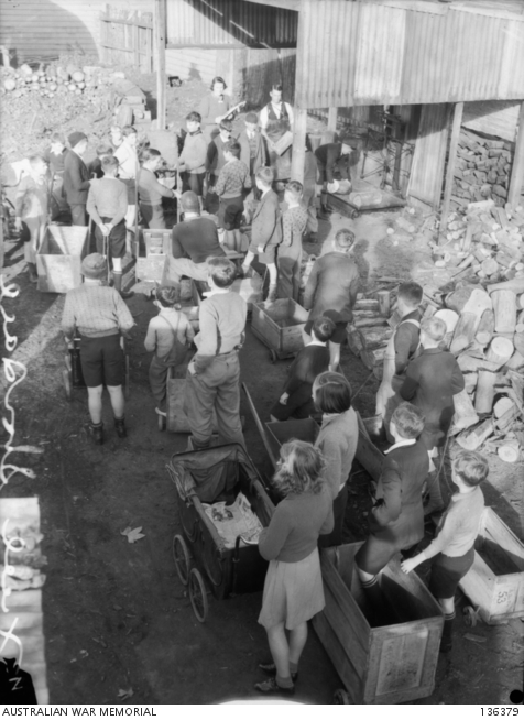 Children with they prams and billy carts lining up at the wood yard to buy their meagre ration of firewood. Note wood being weighed on scales.