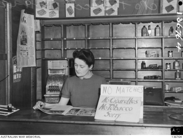 A woman shop assistant stands behind a counter with a sign reading ‘No matches, no cigarettes, no tobacco’. This is the effect of rationing. Note the empty shelves behind her.
