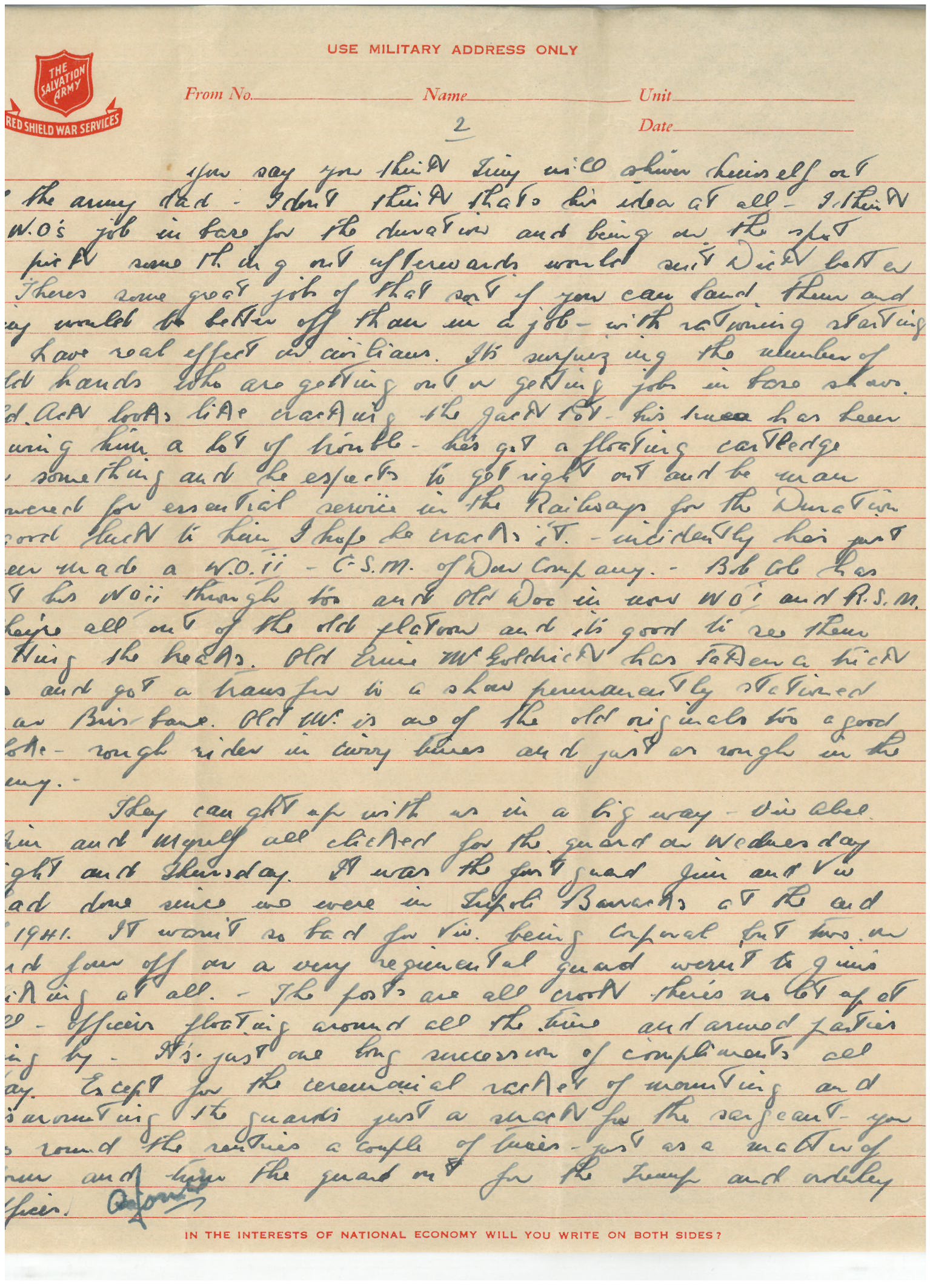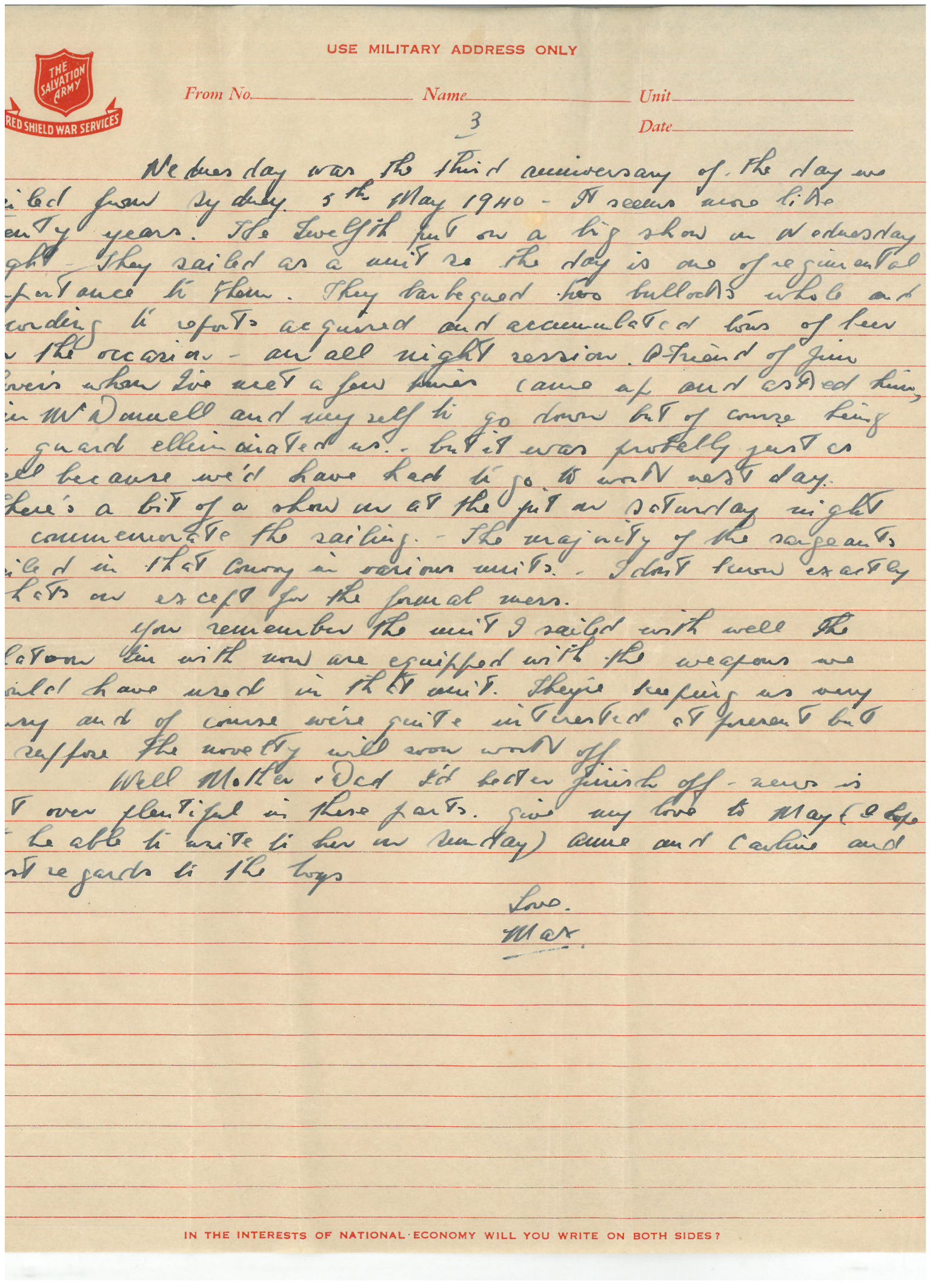 Well Mother & Dad I’d better finish off. News is not over plentiful in these parts. Give my love to May (I hope to be able to write to her on Sunday), Anne and Carline and best regards to the boys.
