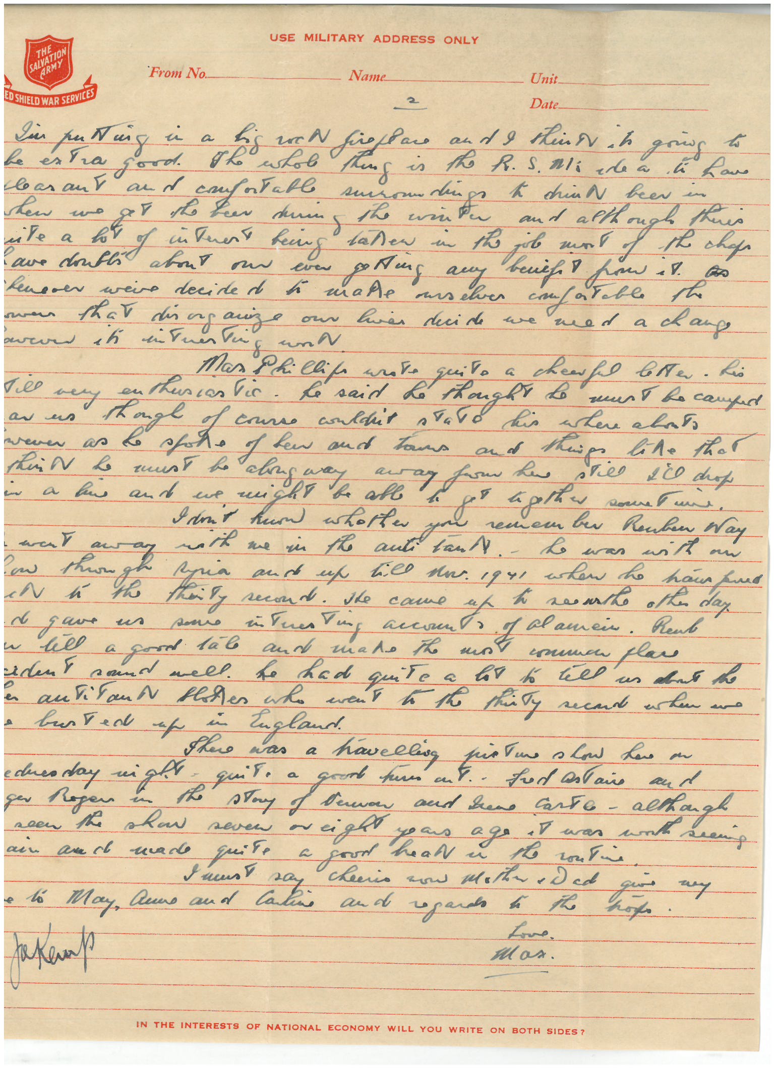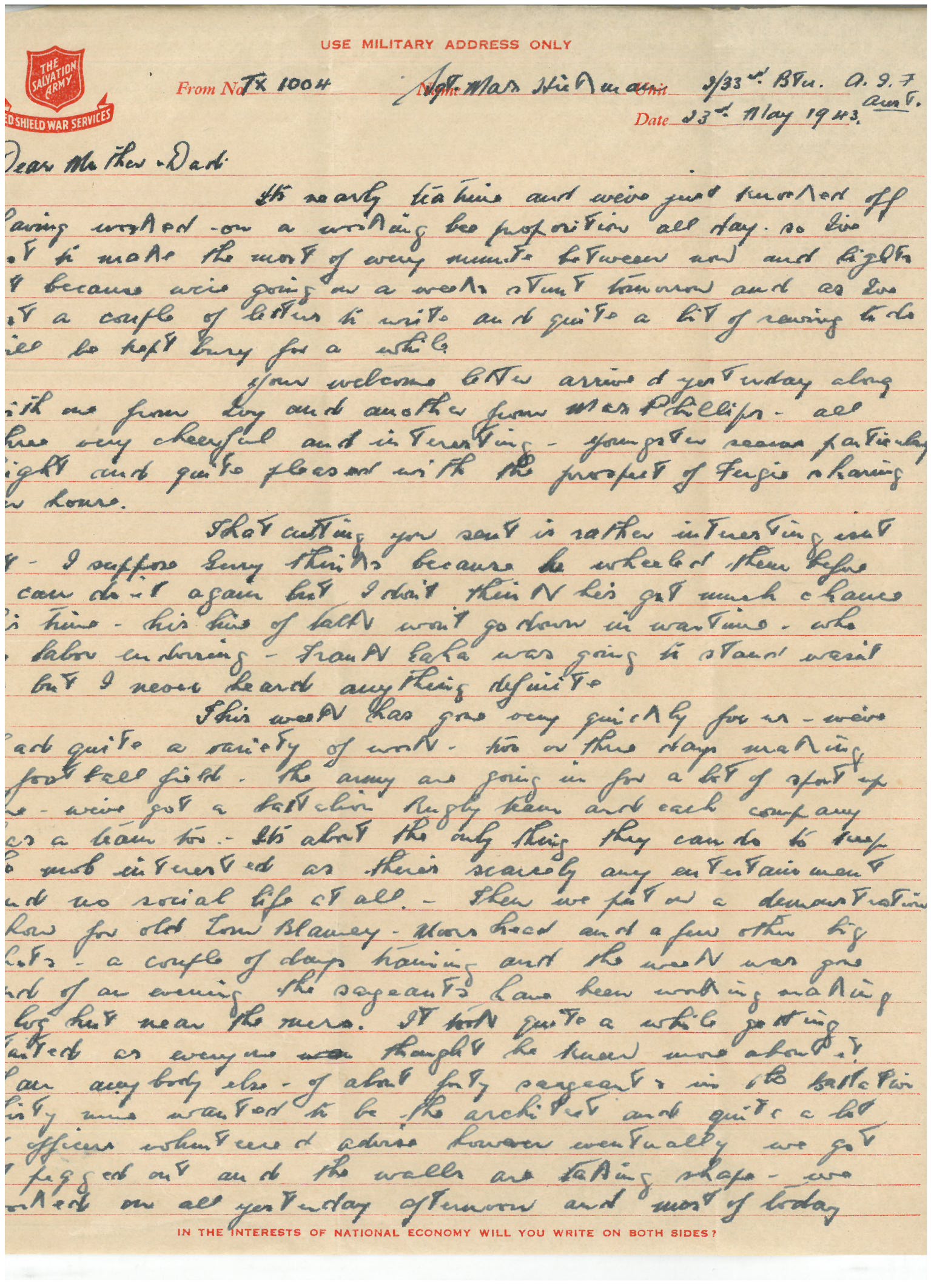 I must say cheerio now Mother & Dad. Give my love to May, Anne and Carline and regards to the troops