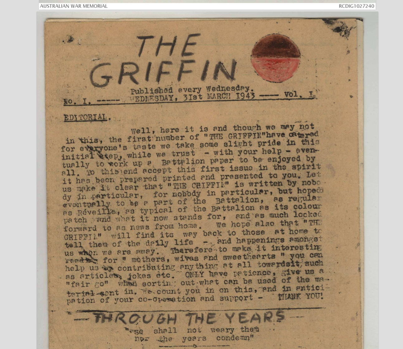 Part of the editorial in the very first Griffin (March 31 1943) is transcribed here :