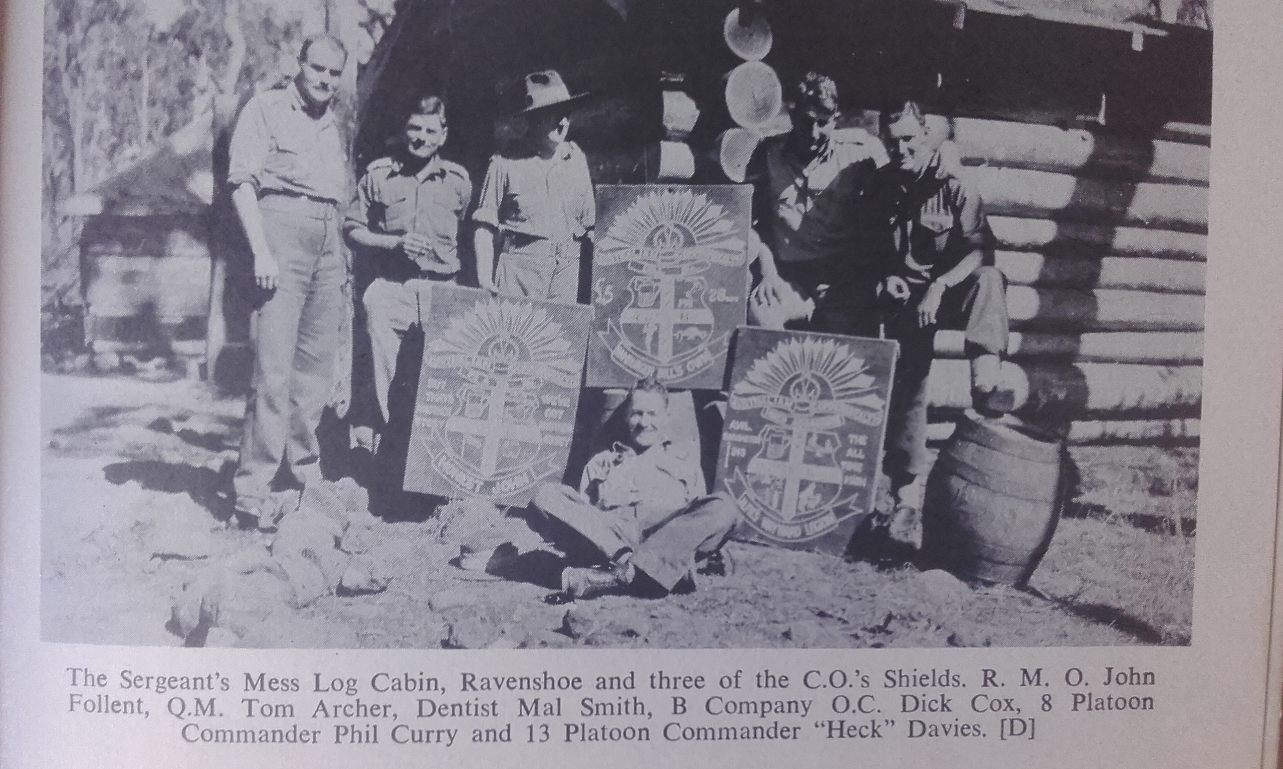 The sergeants really became active and on days off over a period of two months built a tremendous log cabin hut. It was 50 feet long and 18 feet wide. The trees used for it were ten inches in diameter and the gaps were caulked with mud and cement. Inside the cabin a six-foot high by eight-feet wide creek-stone fireplace was erected…..Max Hickman, a builder from way back, supervised the construction. Such was their spirit that on returning from a 30 or 40 mile, four or five days’ exercise the warrant officers and sergeants would set to and do some more work on the place to the accompanying cries and catcalls of the men of the battalion.