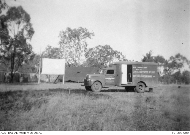Mobile Cinema Unit 6 (Q) operated by the State Welfare Institute, Australian Comforts Fund with open-air screen
