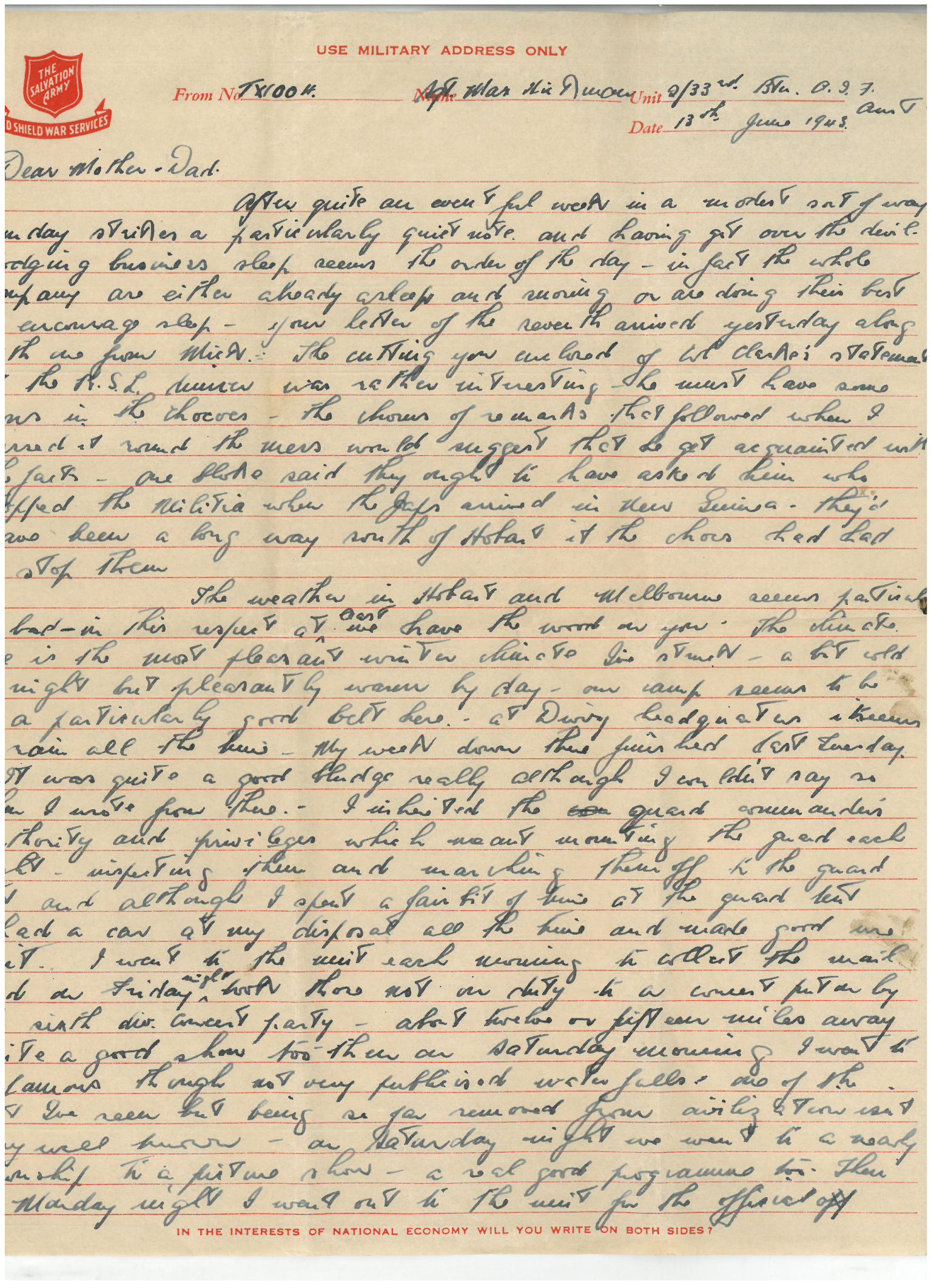 After quite an eventful week in a modest sort of way Sunday strikes a particularly quiet note and having got over the devil-dodging business sleep seems the order of the day – in fact the whole company are either already asleep and snoring or are doing their best to encourage sleep. Your letter of the seventh arrived yesterday along with one from Mick. The cutting you enclosed of Col Clarke’s statement at the RSL dinner was rather interesting – he must have some sons in the chocoe’s. The chorus of remarks that followed when I passed it round the mess would suggest that he get acquainted with the facts. One bloke said they ought to have asked him who stopped the Militia when the Japs arrived in New Guinea – they’d have been a long way south of Hobart if the choc’s had had to stop them.