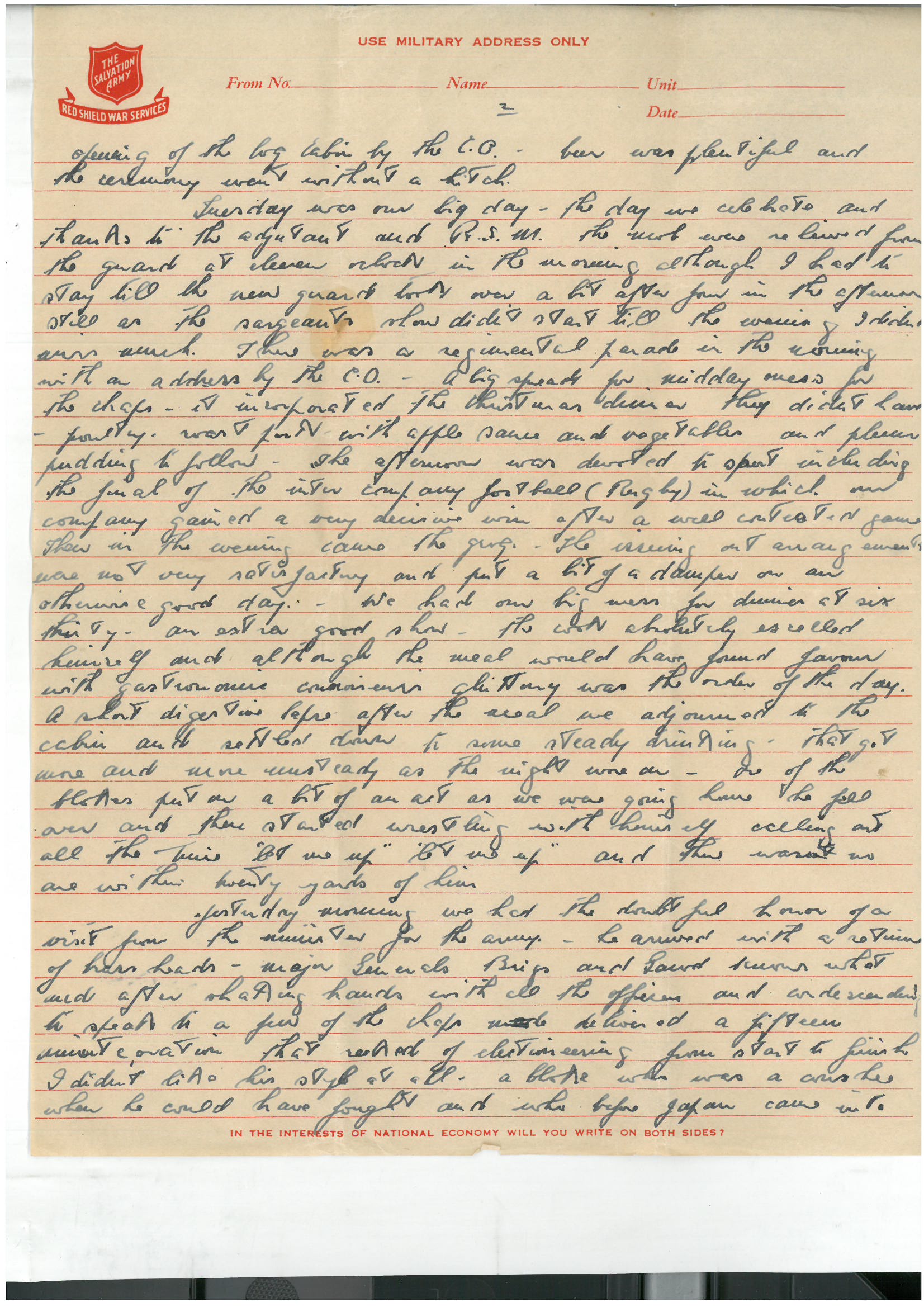 Tuesday was our big day – the day we celebrate – and thanks to the adjutant and RSM the mob were relieved from he guard at eleven o’clock in the morning although I had to stay till the new guard took over a bit after four int he afternoon. Still as the sergeants show didn’t start till the evening I didn’t miss much. There was a regimental parade in the morning with an address by the CO, a big spread for midday mess for the chaps – it incorporated the Christmas dinner they didn’t have – poultry, roast pork with apple sauce and vegetables and plum pudding to follow. The afternoon was devoted to sport including the final of the inter-company football (Rugby) in which our company gained a very decisive win after a well contested game. Then in the evening came the grog. The issuing out arrangements were not very satisfactory and put a bit of a damper on an otherwise good day. We had our big mess for dinner at six thirty – an extra good show – the cook absolutely excelled himself and although the meal would have found favour with gastronomic connoisseurs, gluttony was the order of the day. A short digestive lapse after the meal we adjourned to the cabin and settled down to some steady drinking – that got more and more unsteady as the night wore on. One of the blokes put on a bit of an act as we were going home – he fell over and started wrestling with himself, calling out all the time “let me up, let me up” and there was no one within twenty yards of him.