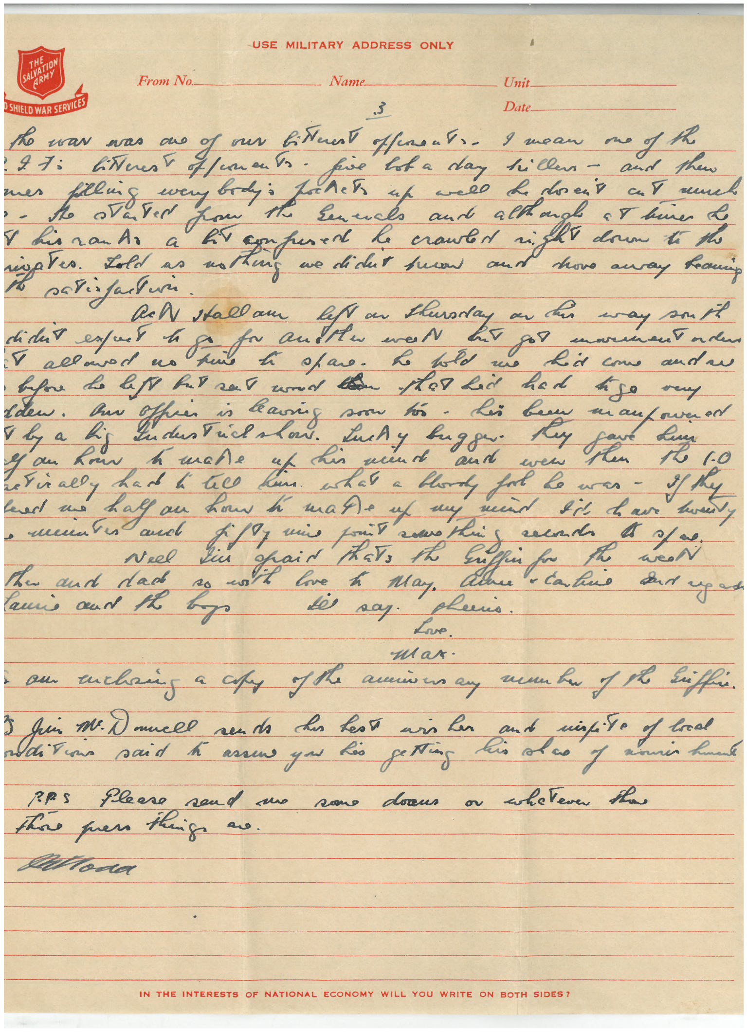 Well I’m afraid that’ the Griffin for the week Mother and Dad so with love to May, Anne & Carline and regards to Laurie and the boys I’ll say cheerio.