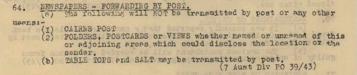 The waterfall might have been Millstream Falls – most likely not Tully Falls though these are also in the ‘Camera Views’ fold-out that Dad sent home. This item of mail was clearly approved by the censor (signature bottom left) so it is interesting that after it was sent, the CO issued routine orders specifically forbidding such items being posted as they indicate the area in which the Bn is operating. See Bn Diary – Routine Order for 13 June 1943 (RCDIG1027240) :