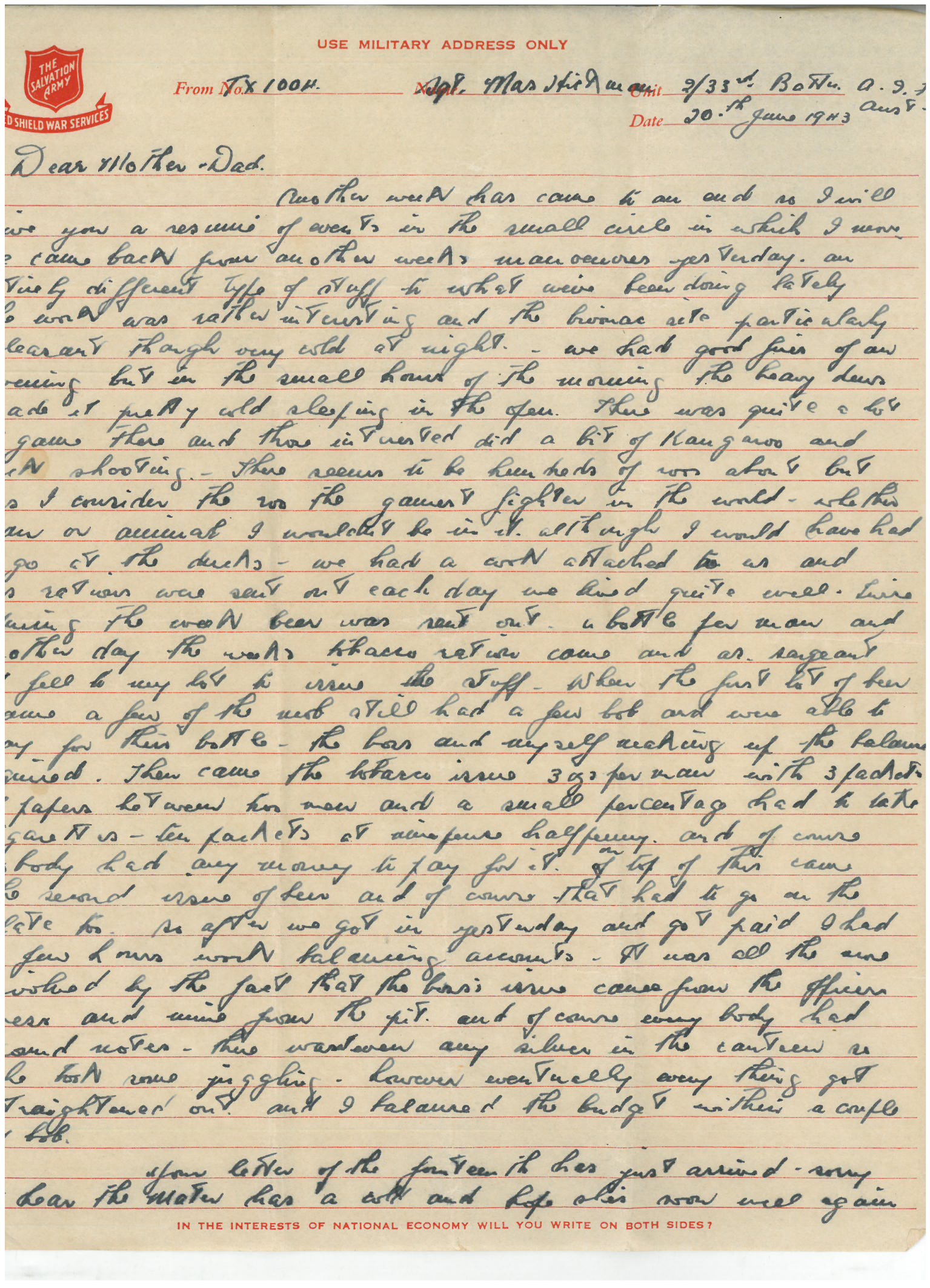 Another week has come to an end so I will give you a resume of events in the small circle in which I move. We came back from another week’s manoeuvres yesterday – an entirely different type of stuff to what we’ve been doing lately. The work was rather interesting and the bivouac site particularly pleasant though very cold at night. We had good fires of an evening but in the small hours of the morning the heavy dews made it pretty cold sleeping in the open spaces. There was quite a lot of game there and those interested did a bit of kangaroo and duck shooting. There seem to be hundreds of roos about but as I consider the roo the gamest fighter in the world, whether man or animal, I wouldn’t be in it – although I would have had a go at the ducks. We had a cook attached to us and his rations were sent out each day. We lived quite well.