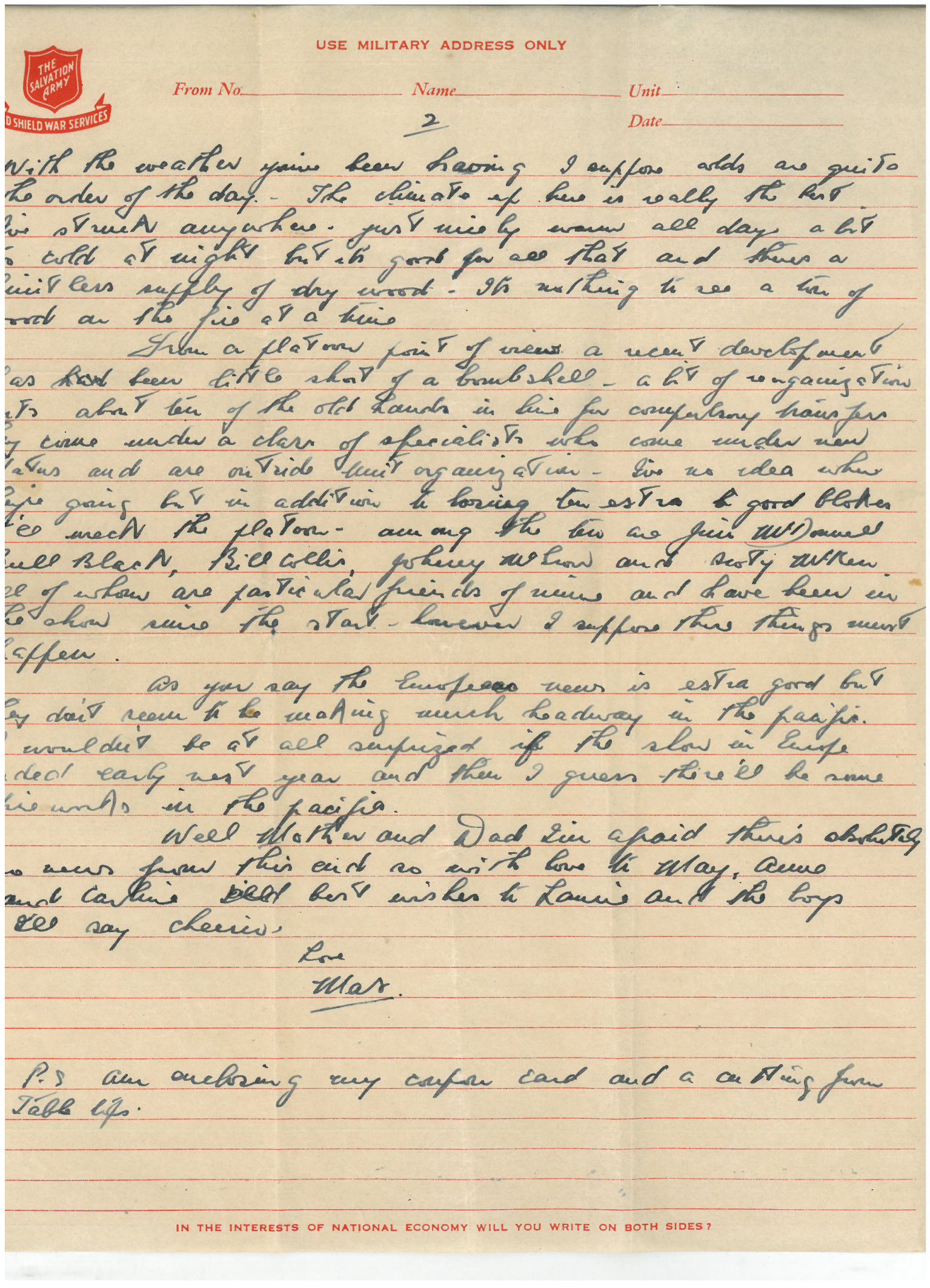 Well Mother and Dad I’m afraid there’s absolutely no news from this end so with love to May, Anne and Carline – best wishes to Laurie and the boys, I’ll say cheerio. Love – Max.