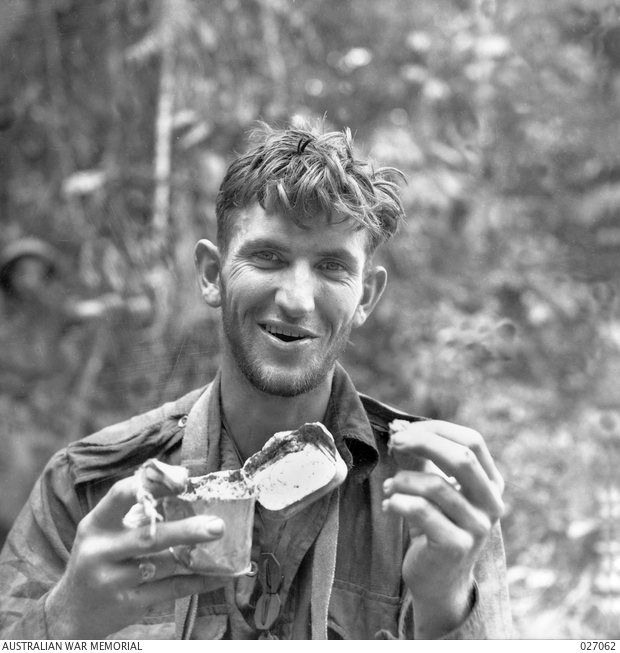 Dated October 1942 this photo shows Private R Shimmin (NX44065) of the 2/33rd Battalion ‘starts on his daily ration of bully beef straight out of the tin. Bully, biscuits and water was all the men had for three days. No doubt ‘stunts’ were good preparation.