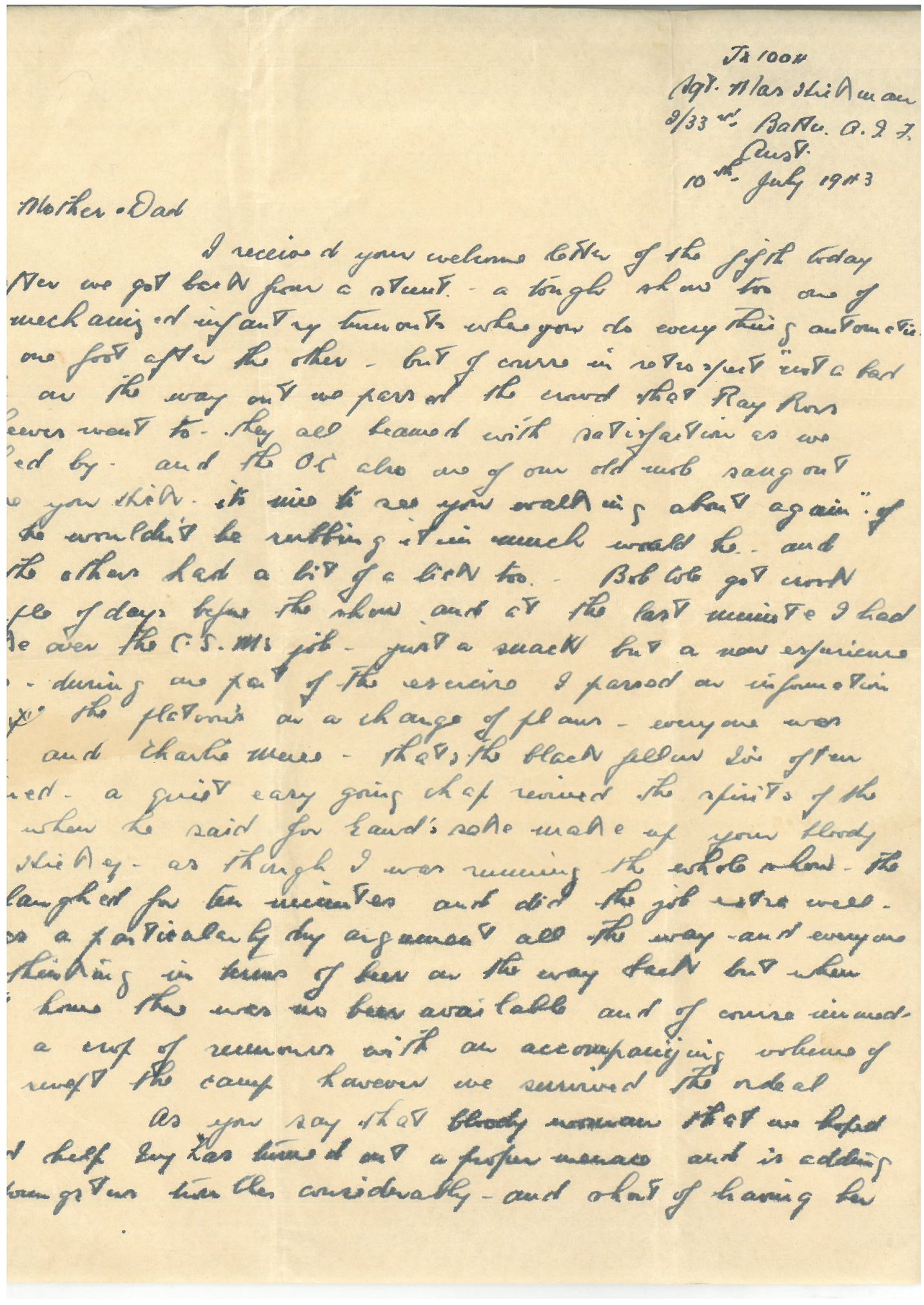 I received your welcome letter of the fifth today just after we got back from a stunt – a tough show too – one of those mechanised infantry turnouts where you do everything automatically – one foot after the other – but of course in retrospect not a bad show. On the way out we passed the crowd that Ray Ross and Geeves went to – they all beamed with satisfaction as we marched by – and the OC also one of our old mob sang out ‘How are you Hick – it’s nice to see you walking about again’. Of course he wouldn’t be rubbing it in much would he – and all the others had a bit of a lick too. Bob Cole got crook a couple of days before the show and at the last minute I had to take over the CSM’s job – just a snack but a new experience for me. During one part of the exercise I passed on information to the platoons on a change of plans. Everyone was all in, and Charlie Mene – that’s the black fellow I’ve often mentioned – a quiet easy going chap – revived the spirits of the mob when he said ‘for Gawd’s sake make up your bloody mind Hickey’ – as though I was running the whole show. The mob laughed for ten minutes and did the job extra well. It was a particularly dry argument all the way, and everyone was thinking in terms of beer on the way back but when we got home there was no beer available and of course immediately a crop of rumours with an accompanying volume of abuse swept the camp. However we survived the ordeal.