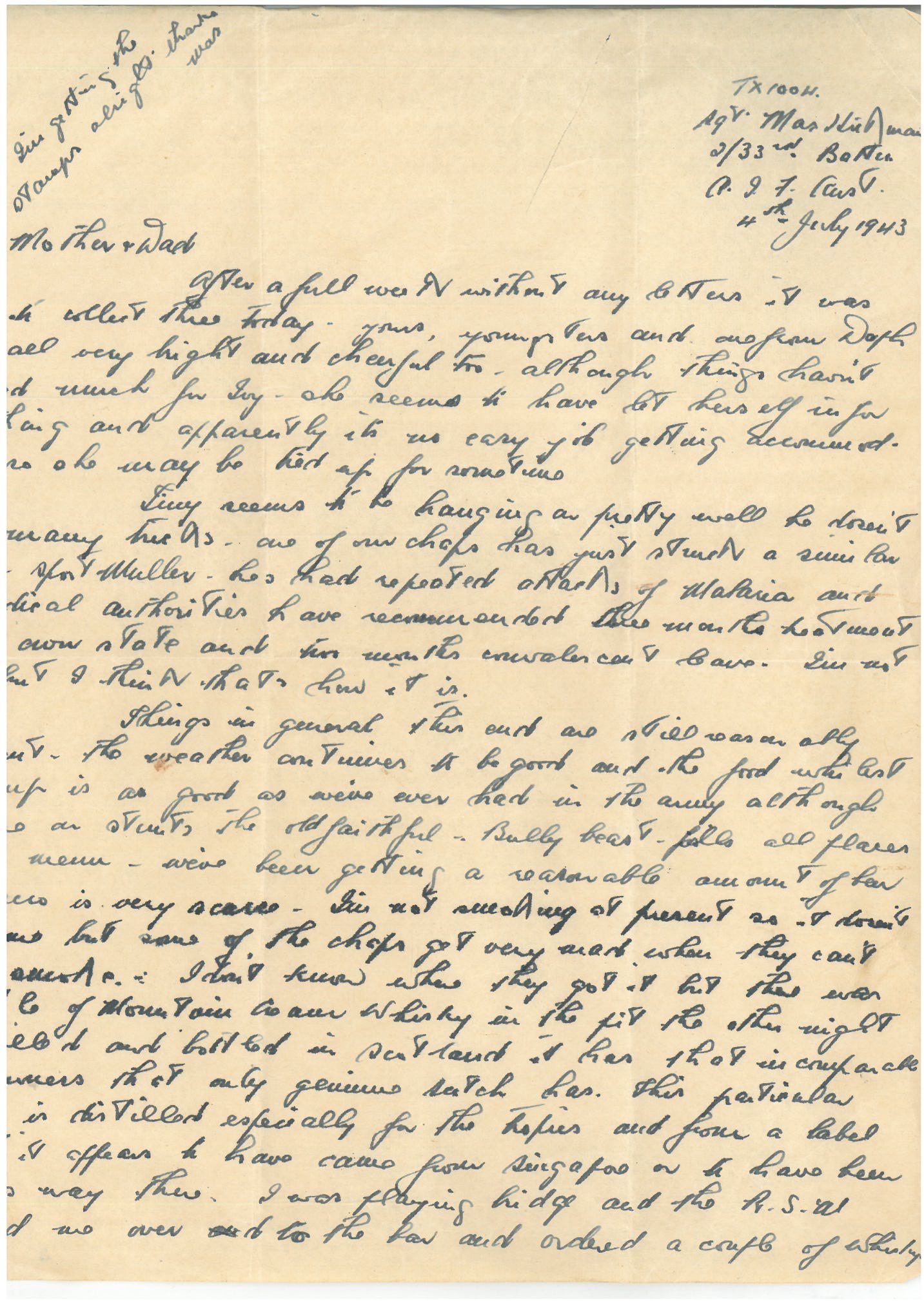 Things in general this end are still reasonably pleasant. The weather continues to be good and the food – whilst of course on stunts the old faithful Bully beast fills all places in the menu – we’ve been getting a reasonable amount of beer but tobacco is very scarce. I’m not smoking at present as it doesn’t worry me but some of the chaps get very mad when they can’t get a smoke. I don’t know where they got it but there was a bottle of Mountain C…. Whisky in the pit the other night – distilled and bottled in Scotland it has that incomparable mellowness that only genuine Scotch has. This particular brand is distilled especially for the tropics and from a label on it, it appears to have come from Singapore or to have been on its way there. I was playing bridge and the RSM called me over to the bar and ordered a couple of whisky’s and he said if that’s not the best whisky you’ve ever tasted I’ll give up. It was too – it was bloody beautiful. Without any breaking down it had the most palatable velvetyness of any drink I’ve ever had. One of the bridge players had to go on duty so Pete McCowan and the other player joined us at the bar and we were lucky enough to get another drink before the bottle was empty. There’s been quite a bit of good grog floating around lately. I was putting a mantle up in the officers mess the other day and the steward told me there’s been some good stuff – champagne and all – coming in. I guess they must have jacked up on (Corio?) and other forms of Methylated spirits.