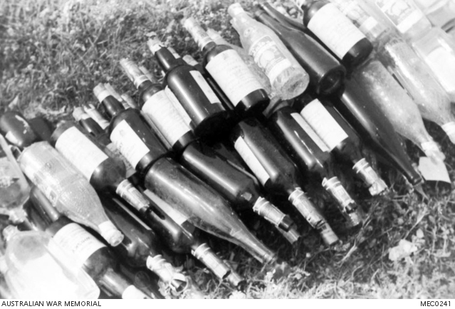 May 1943: The morning after sees a nice batch of “dead marines” (empty beer and spirits bottles) outside the Officers’ Mess of a RAAF squadron in Tunisia.