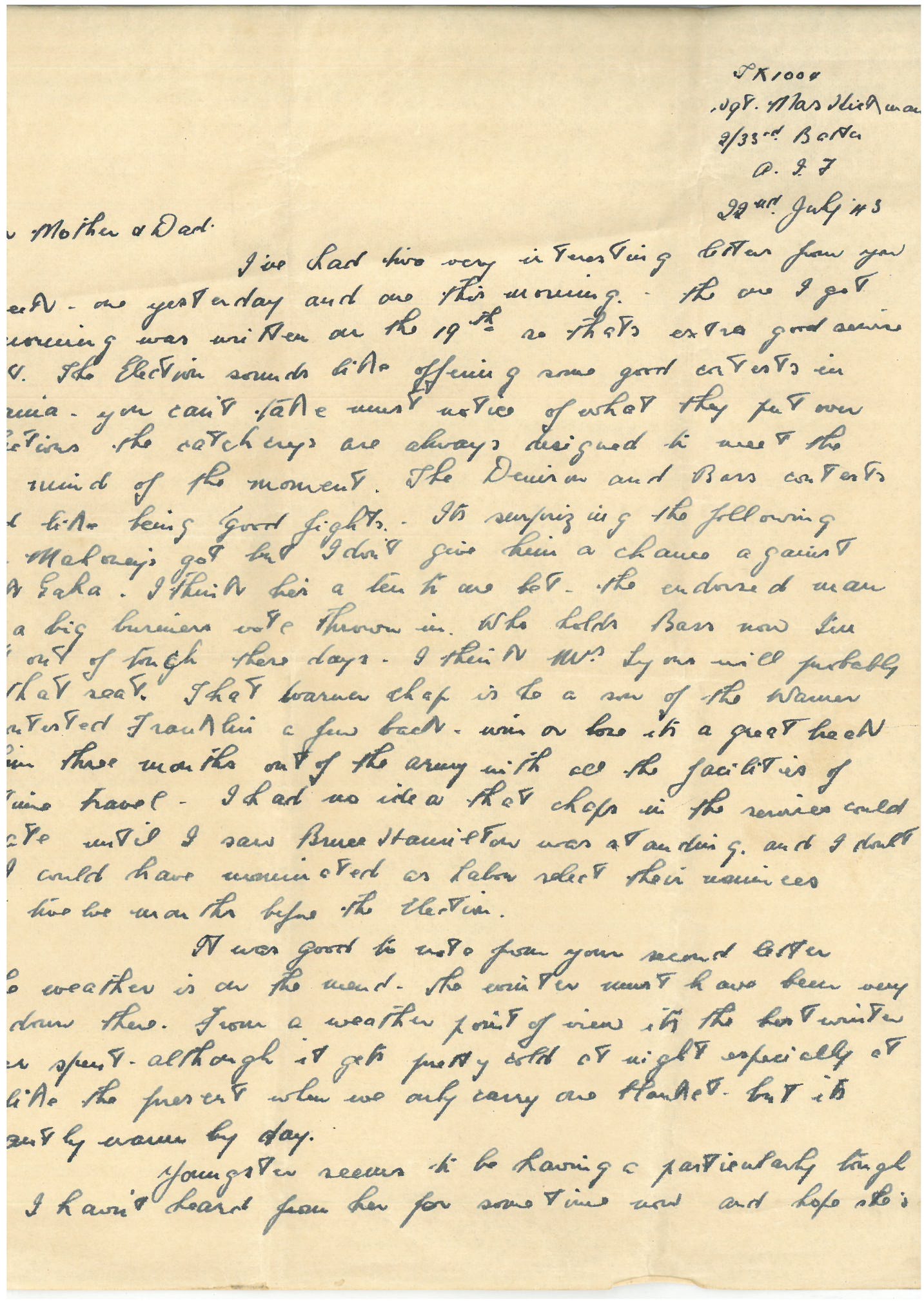 I’ve had two very interesting letters from you this week. One yesterday and one this morning. The one I got this morning was written on the 19th, so that’s extra good service isn’t it? The election sounds like offering some good contests in Tasmania. You can’t take much notice of what they put over in elections – the catch-cries are always designed to meet the public mind of the moment. The Denison and Bass contests sound like being good fights. It’s surprising the following Gerry Mahoney’s got but I don’t give him a chance against Frank Gaha – I think he’s a ten to one bet – the endorsed man with a big business vote thrown in. Who holds Bass now? – I’m right out of touch these days. I think Mrs Lyons will probably win that seat. That Warner chap – is he a son of the Warner who contested Franklin a few back? Win or lose it’s a great break for him, three months out of the army with all the facilities of peacetime travel. I had no idea that chaps in the services could nominate until I saw Bruce Hamilton was standing and I doubt that I could have nominated as Labor select their nominees six to twelve months before the election.
