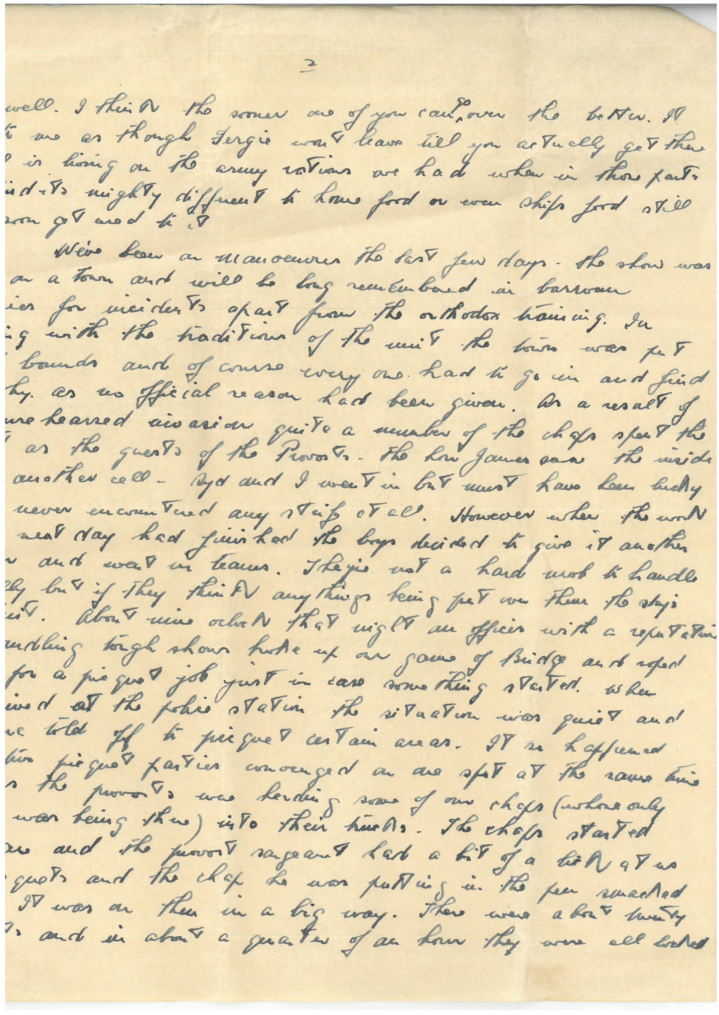 We’ve been on manoeuvres the last few days. The show was based on a town and will be long remembered in bar-room memories for incidents apart from the orthodox training. In keeping with the traditions of the unit, the town was put out of bounds and of course everyone had to go in and find out why, as no official reason had been given. As a result of the unrehearsed invasion quite a number of the chaps spent the night as the guests of the Provosts. The Hon James saw the inside of yet another cell – Syd and I went in but must have been lucky as we never encountered any strife at all. However when the work of the next day had finished the boys decided to give it another flutter and went in teams. They’re not a hard mob to handle normally but if they think anything’s being put over them the sky’s the limit. About nine o’clock that night an officer with a reputation for handling tough shows broke up our game of bridge and roped us in for a picquet job just in case something started. When we arrived at the police station the situation was quiet and we were told off to picquet certain areas. It so happened that two picquet parties converged on one spot at the same time just as the provosts were herding some of our chaps (whose only offence was being there) into their trucks. The chaps started to argue and the provost sergeant had a bit of a lick at us as picquets and the chap he was putting in the pen smacked him. It wagon then in a big way. There were about twenty provosts and in about a quarter of an hour they were all locked in their own trucks and sent back to the police station to the amusement of the townspeople and divvy coppers. It was a mighty humorous show right through though some of the MP’s did get a bit knocked about. During a lull in the show a provost threw a tear gas bomb that spread more among the civvies than us and they beat a retreat with tears streaming down their faces. However the mob came home well pleased with themselves and the battle of ………. will be told and magnified many times when bloodless victories are recounted in the pubs. The old man hasn’t said anything yet about the show but he’ll have to take a dim view of it officially although like Old Hamburger it’ll probably warm the cockles of his heart.