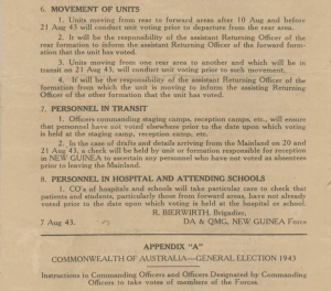 The government did its best to ensure that all those on active service were able to vote. Details of procedures to be followed were set out in the Commonwealth Electoral (War time) Act no.27 of 1943: http://www.austlii.edu.au/au/legis/cth/num_act/cea1943271943342/ and distributed to all units – (these items from the unit war diary July – Sept 1943 AWM RCDIG1027241)