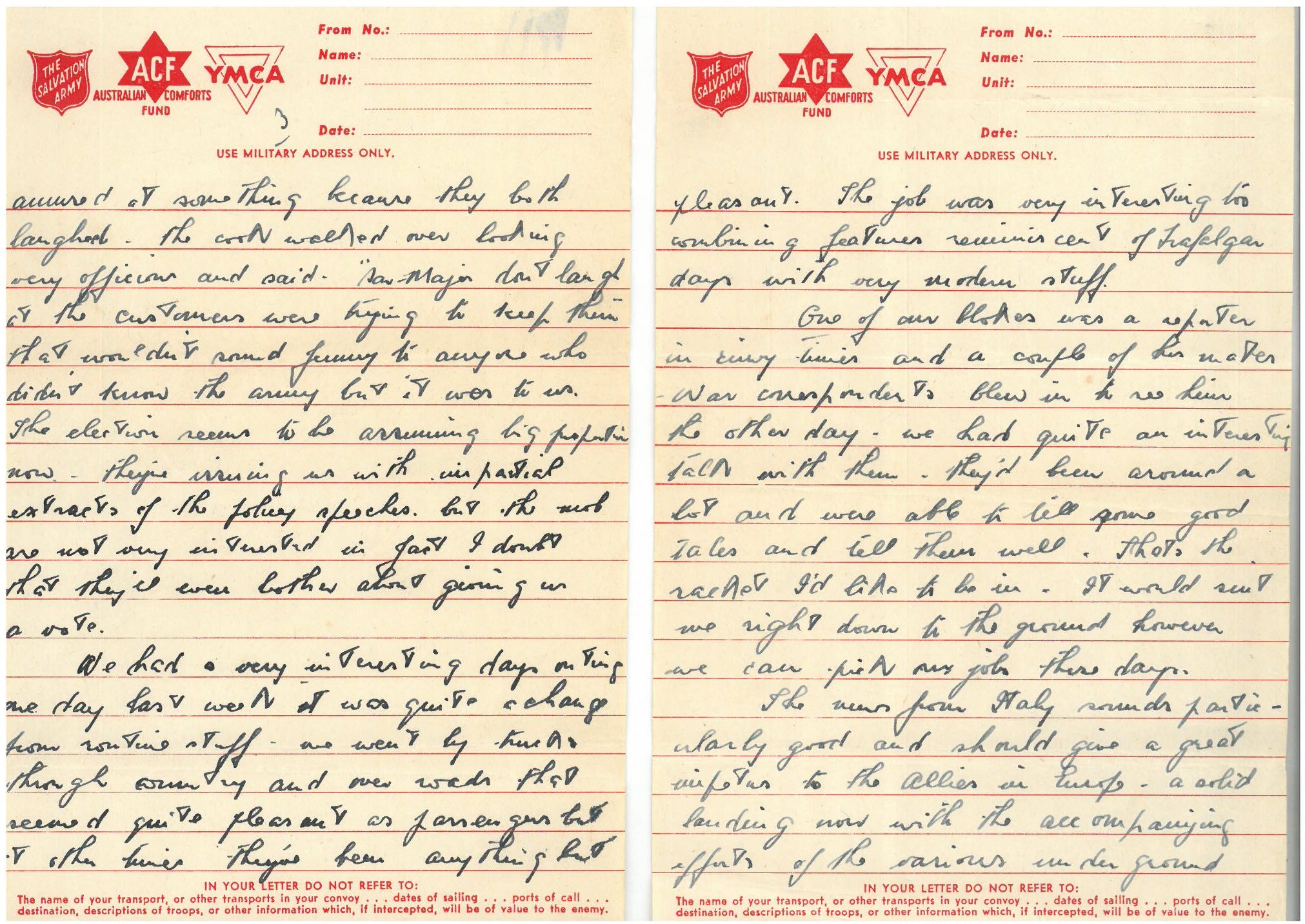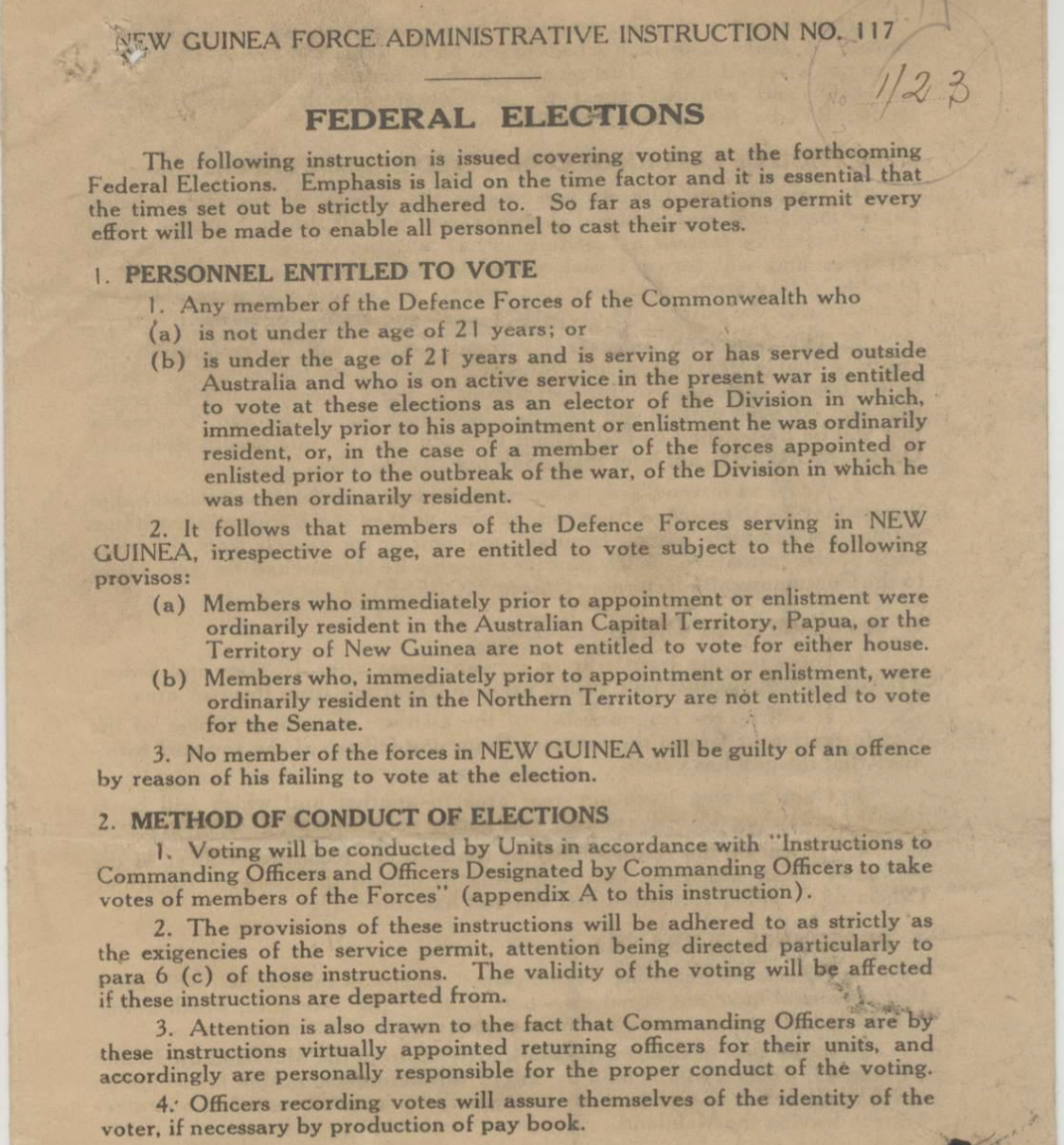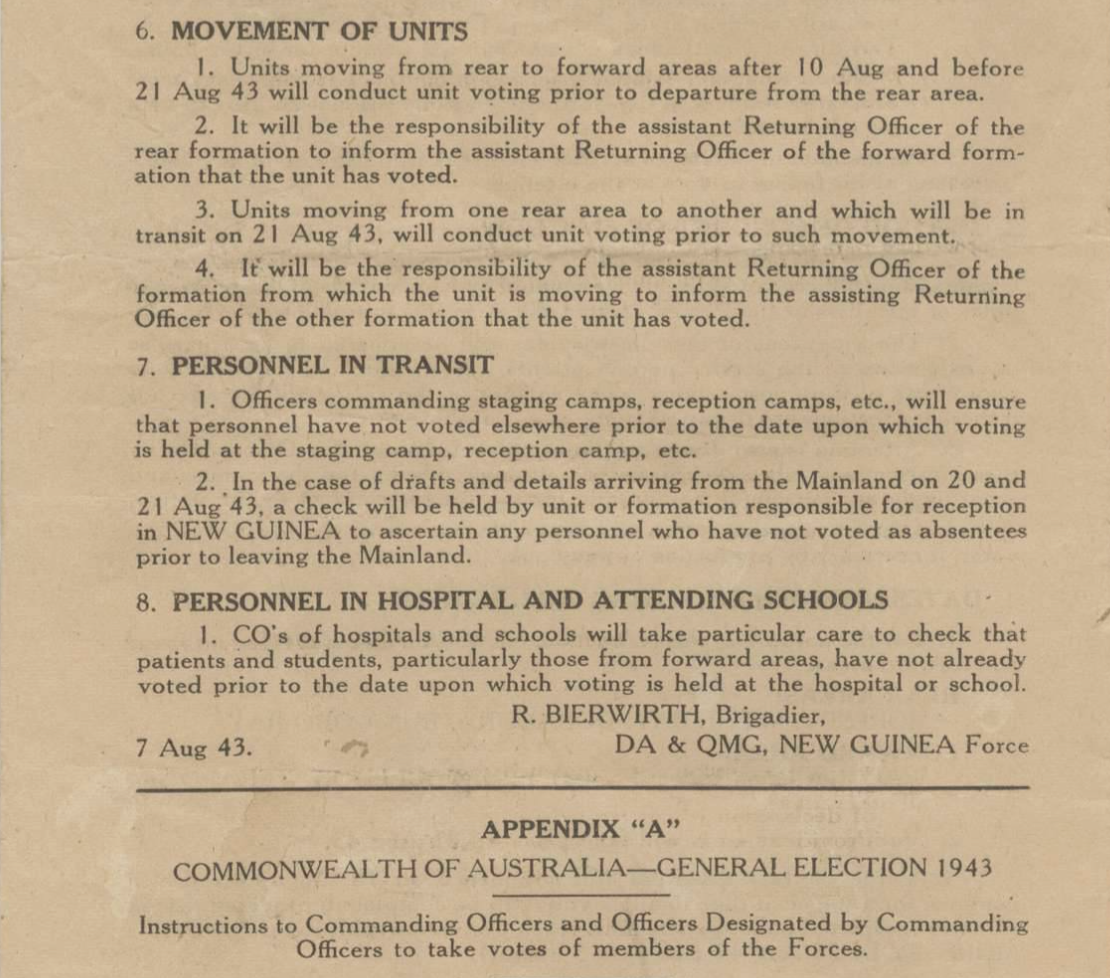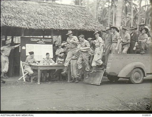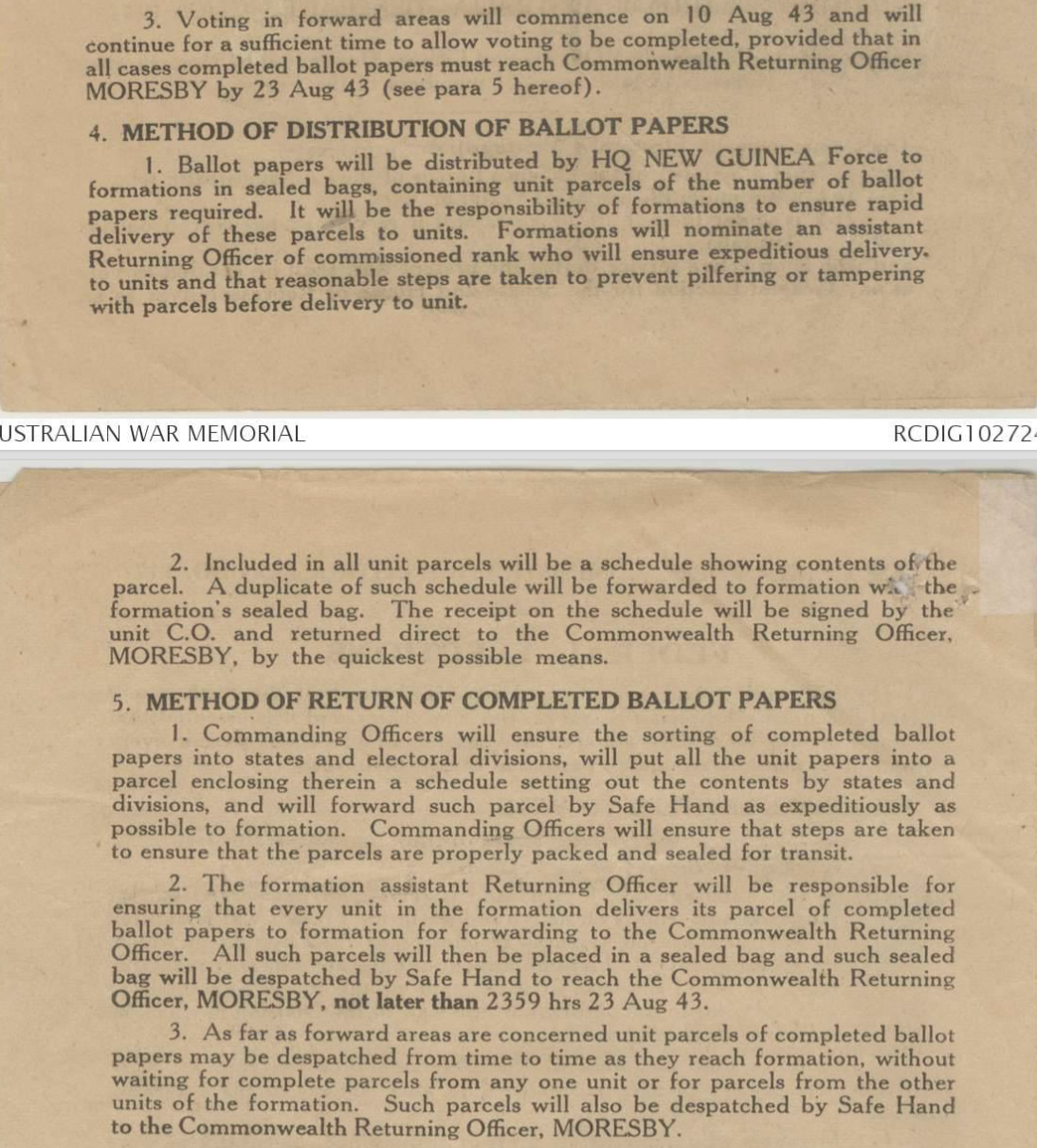 The government did its best to ensure that all those on active service were able to vote. Details of procedures to be followed were set out in the Commonwealth Electoral (War time) Act no.27 of 1943: http://www.austlii.edu.au/au/legis/cth/num_act/cea1943271943342/ and distributed to all units – (these items from the unit war diary July – Sept 1943 AWM RCDIG1027241)