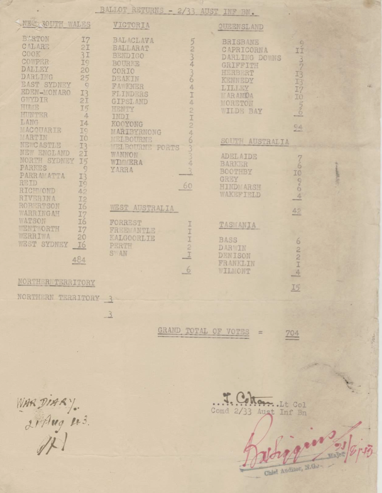 Also from the unit War Diary – a return of votes for each state/ electorate :
