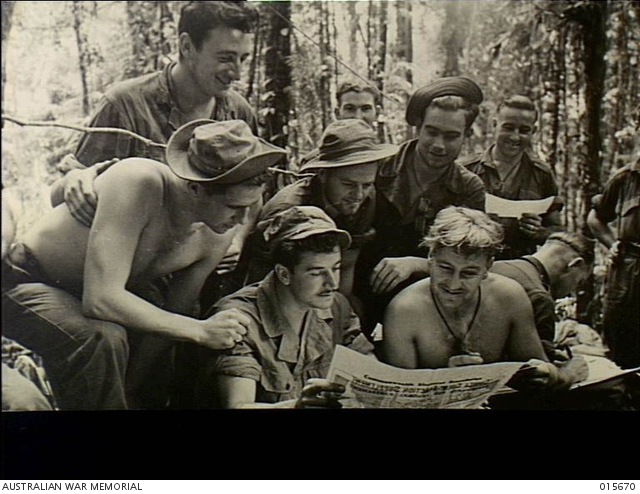 AWM 015670 Goodview Junction, New Guinea. c. 1943-09. Australian troops within half a mile of the Japanese front line, being watched by American colleagues, as they prepare to vote in a Federal election. Consulting an election supplement of the Army newspaper Guinea Gold is Private Alec Salter of Cohuna, Victoria, with Second Lieutenant Ray Nelson of Lacrosse, Wisconsin, seated holding the paper.