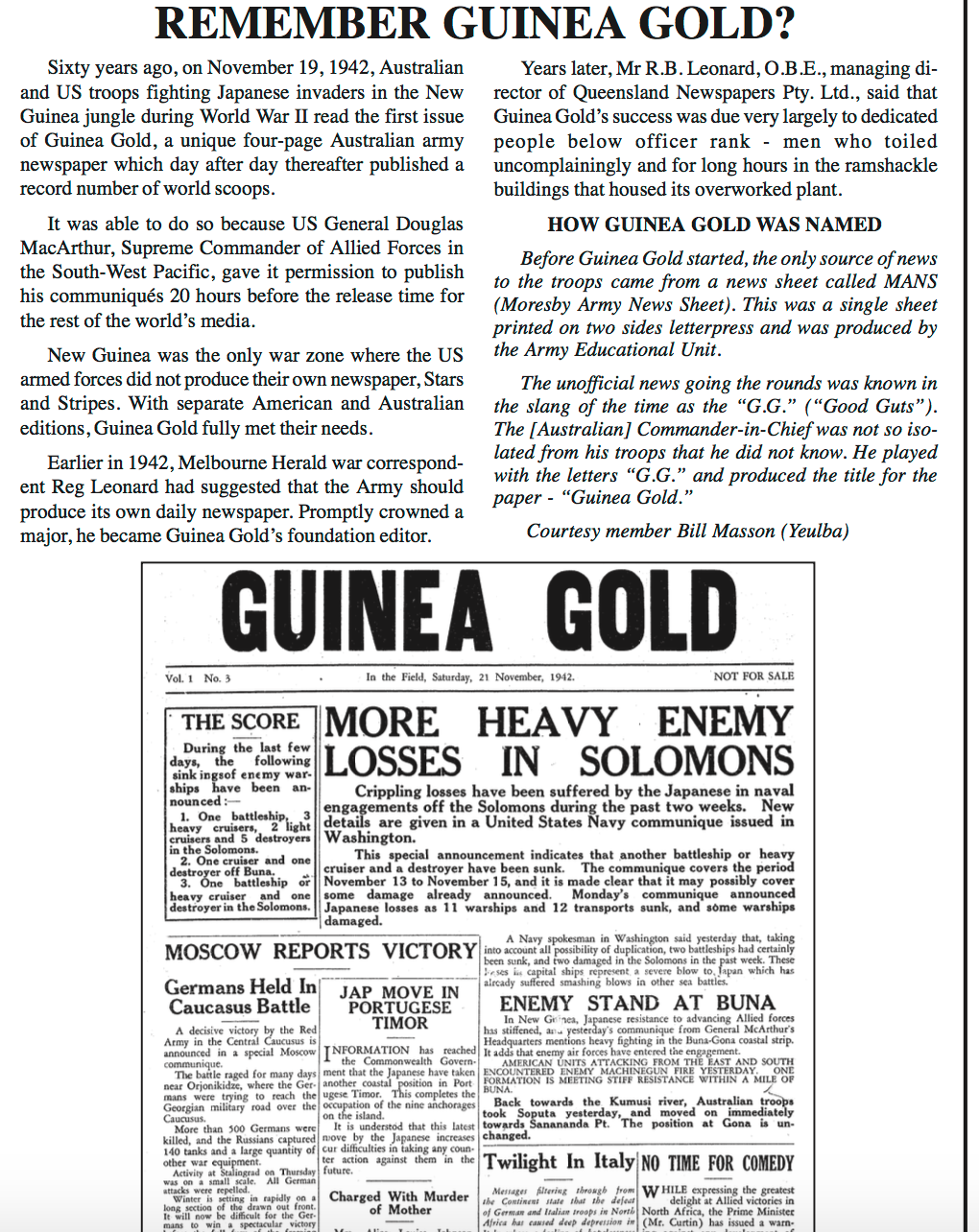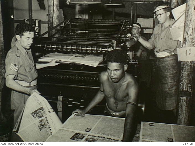 The Guinea Gold newspaper is published for Australian and American troops. Two editions are published, the Australian edition carrying Australian home news, the American edition carrying one page of American home news. A four page sheet, each edition carries three pages of general news interest. This material is mainly rewritten from newspapers. At left is Staff Sergeant John Eyre of Canberra, ACT, taking papers from the press. Stacking papers is native boy Seri Eno. In the background oiling machine is Corporal M. Nicholas of Sydney, NSW. The serviceman oiling the machine has also been identified as Private J W Dormer and Corporal Nicholas is feeding the paper into the press