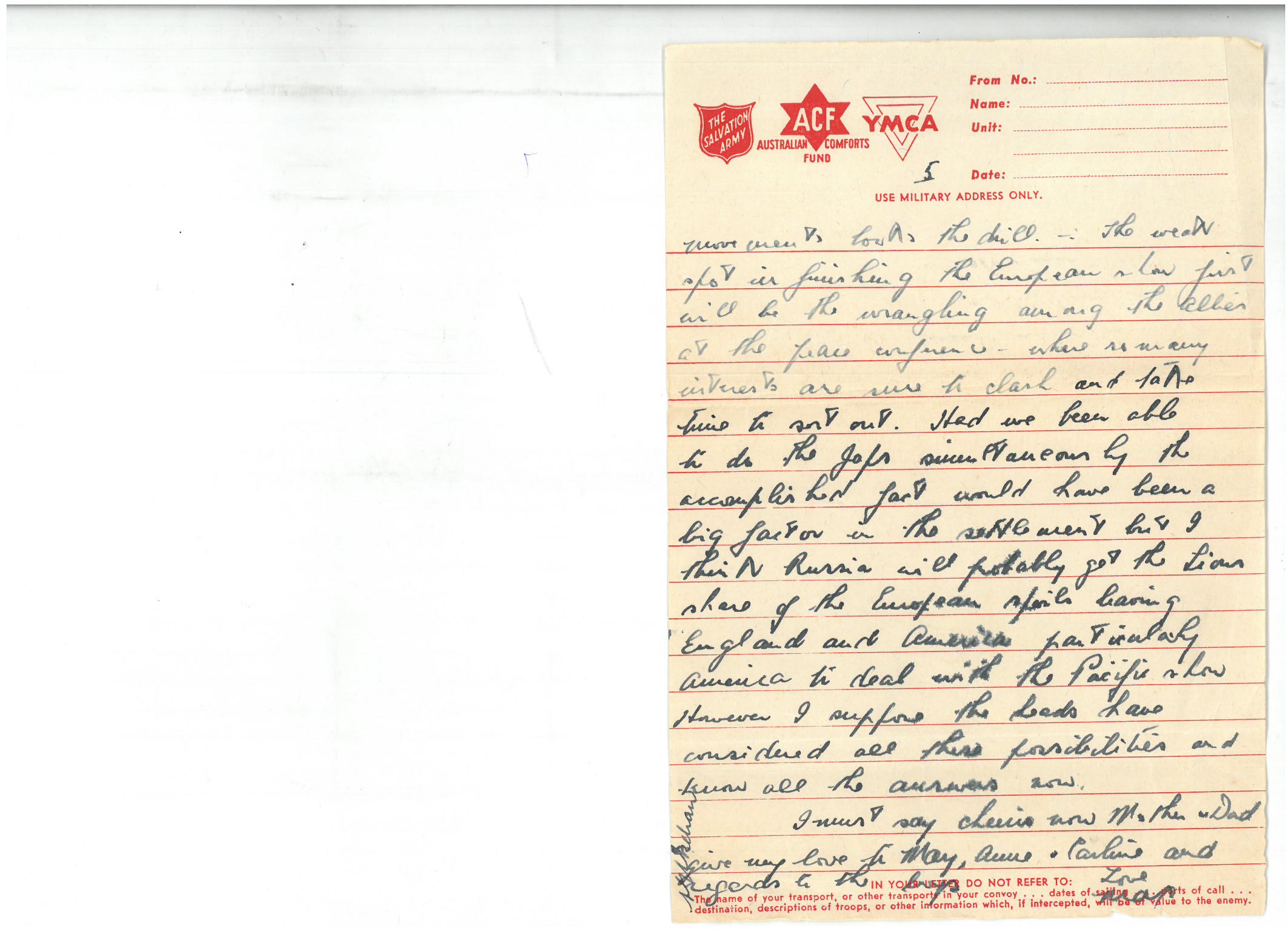 I must say cheerio now Mother & Dad. Give my love to May, Anne & Carline and regards to the boys.