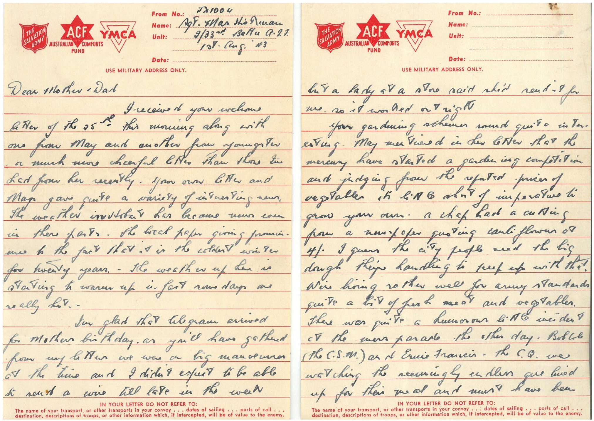 I received your welcome letter of the 25th this morning along with one from May and another from youngster – a much more cheerful letter than those I’ve had from her recently. Your own letter and May’s gave quite a variety of interesting news. The weather in Hobart had become news even in these parts. The local paper giving prominence to the fact that it is the coldest winter for twenty years. The weather up here is starting to warm up in fact some days are really hot.