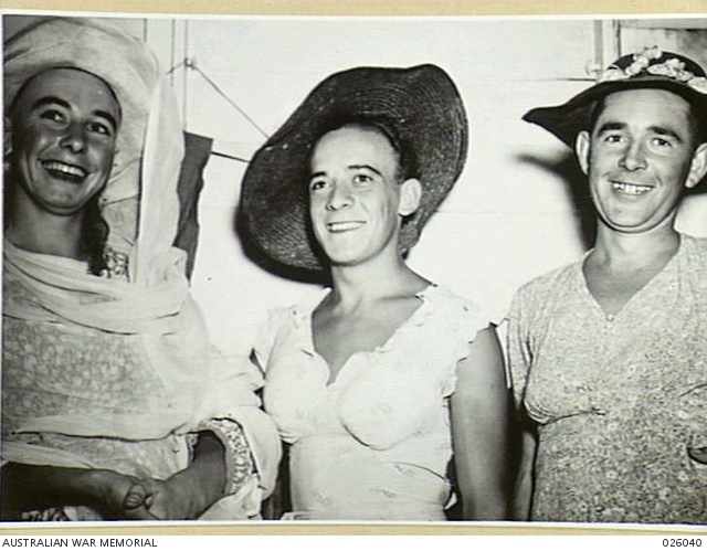 AWM 026040 – The caption does not identify these men, describing them as ‘Three very snappy chorus girls – Australian Army issue” but it does identify them as performers in a Port Moresby concert party