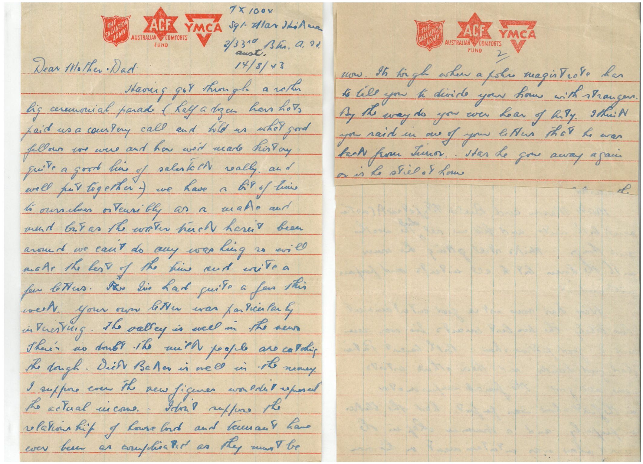 Having got through a rather big ceremonial parade (half a dozen hard hats paid us a courtesy call and told us what good fellows we were and how we’d made history – quite a good line of sales talk really, and well put together ) – we have a bit of time to ourselves, ostensibly as a make and mend but as the water truck hasn’t been around we can’t do any washing so will make the best of the time and write a few letters. I’ve had quite a few this week. Your own letter was particularly interesting. The Valley is well in the news. There’s no doubt the milk people are catching the dough. Dick Baker is well in the money. I suppose even the new figures wouldn’t represent the actual income. I don’t suppose the relationship of house lord [landlord] and tenant have ever been as complicated as they must be now. It’s tough when a police magistrate has to tell you to divide your home with strangers. By the way do you ever hear of Arty? I think you said in one of your letters that he was back from Timor. Has he gone away again or is he still at home? [remainder of page 2 cut off by censor]