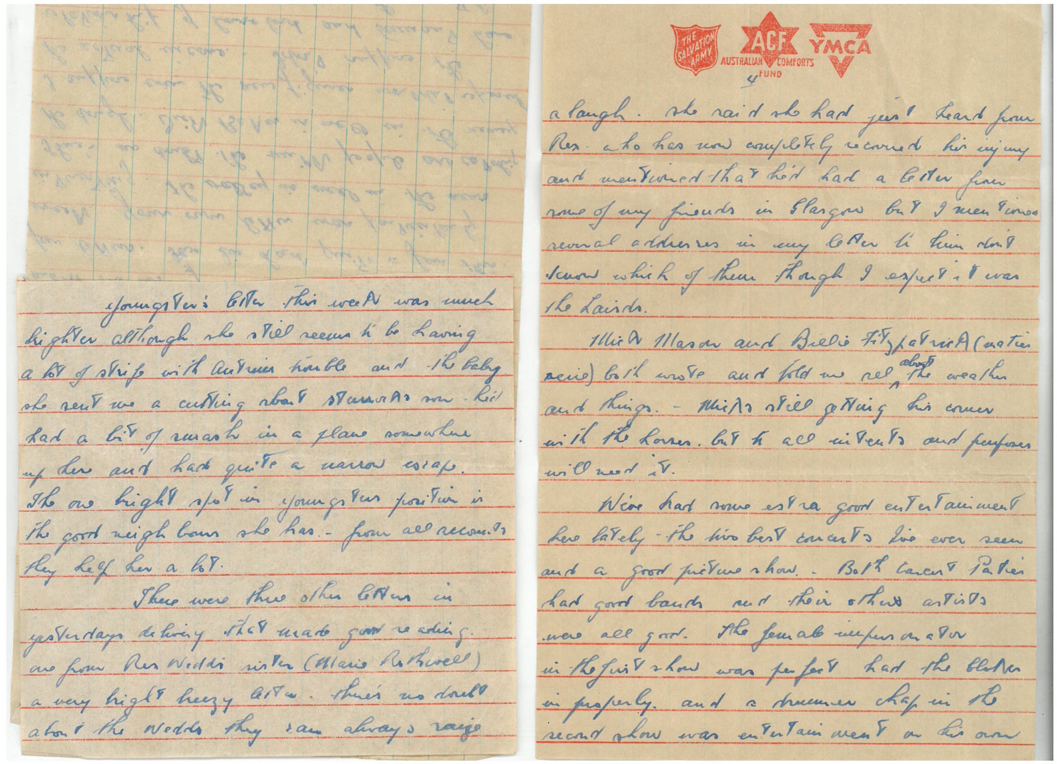 We’ve had some extra good entertainment here lately – the two best concerts I’ve ever seen and a good picture show. Both concert parties had good bands and their other artists were all good. The female impersonator in the first show was perfect and had the blokes in properly and a drummer chap in the second show was entertainment on his own….. [remainder of letter is missing]